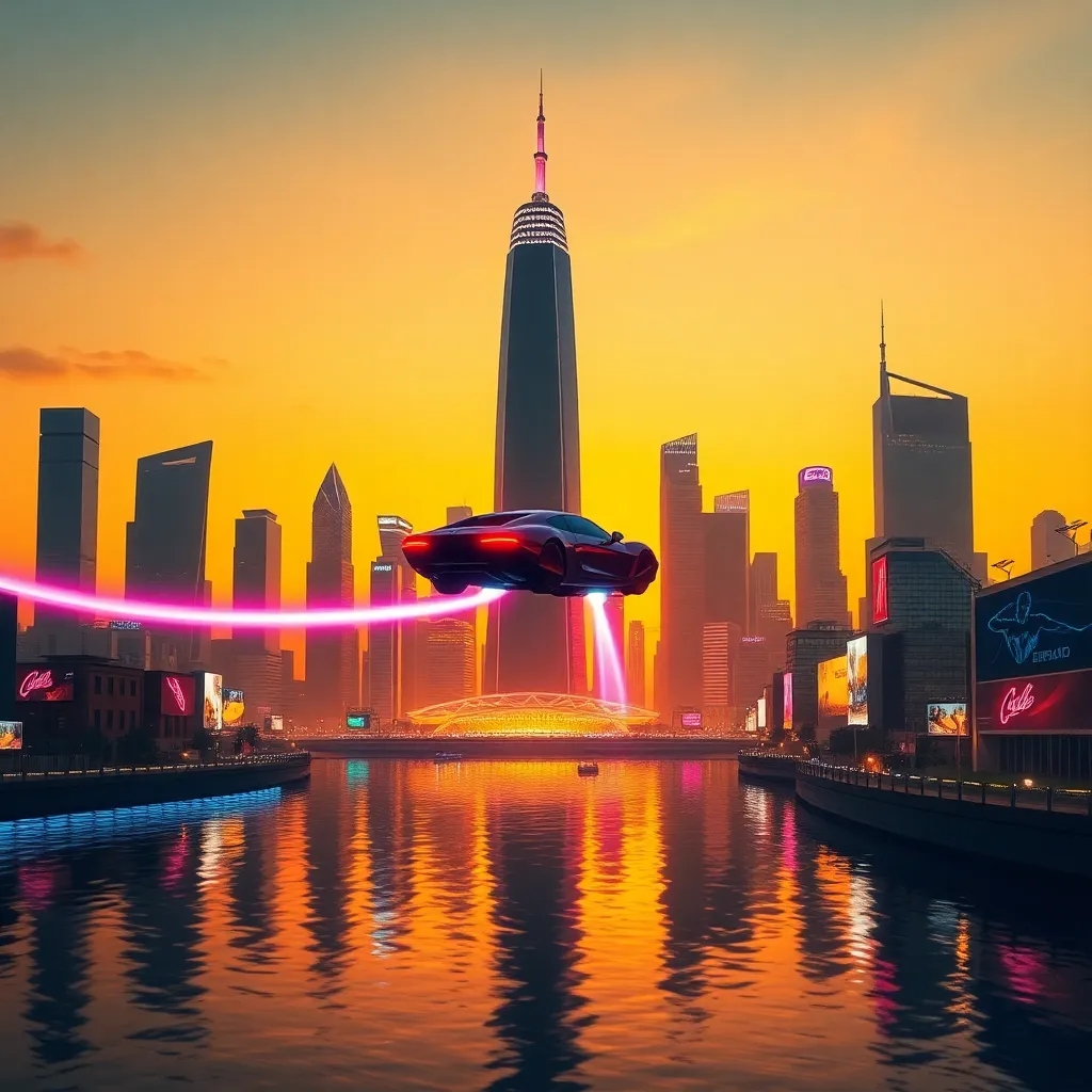 Create a futuristic cityscape at sunset, with sleek skyscrapers and neon lights reflecting off the water. Incorporate a flying car hovering above the city, with a bright pink and blue trail behind it. The sky should be a warm orange-yellow color with a few wispy clouds. Incorporate vibrant, neon-lit billboards and streetlights.