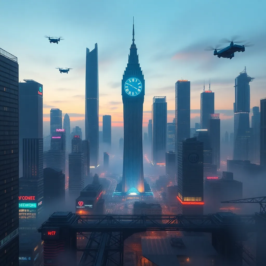 Create an futuristic cityscape at dusk, with sleek skyscrapers and neon-lit streets. Incorporate a prominent clock tower with glowing blue hands, surrounded by a misty atmosphere. Include a few flying drones and hovering cars, with a subtle glow emanating from the city's infrastructure. Blend industrial and organic elements.