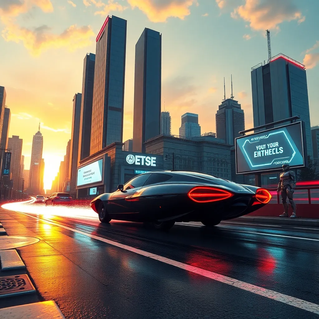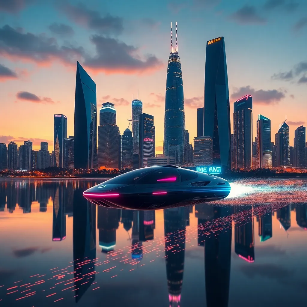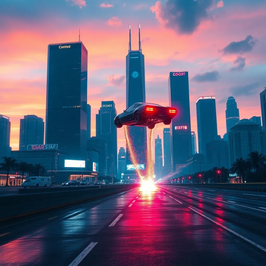 Imagine a futuristic cityscape at dusk, with towering skyscrapers and neon lights reflecting off the wet pavement. A sleek, silver hovercar zooms by, leaving a trail of sparks as it speeds away from a bustling street market. The air is filled with the hum of technology and the chatter of pedestrians.