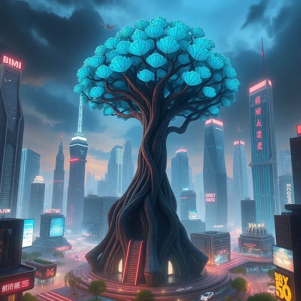 Imagine a futuristic cityscape with a blend of organic and metallic architecture. A majestic tree with glowing blue leaves towers above the skyline, surrounded by sleek skyscrapers and flying cars. The atmosphere is vibrant and alive, with neon lights and holographic advertisements dancing in the air.