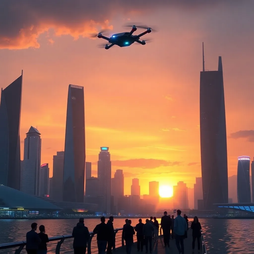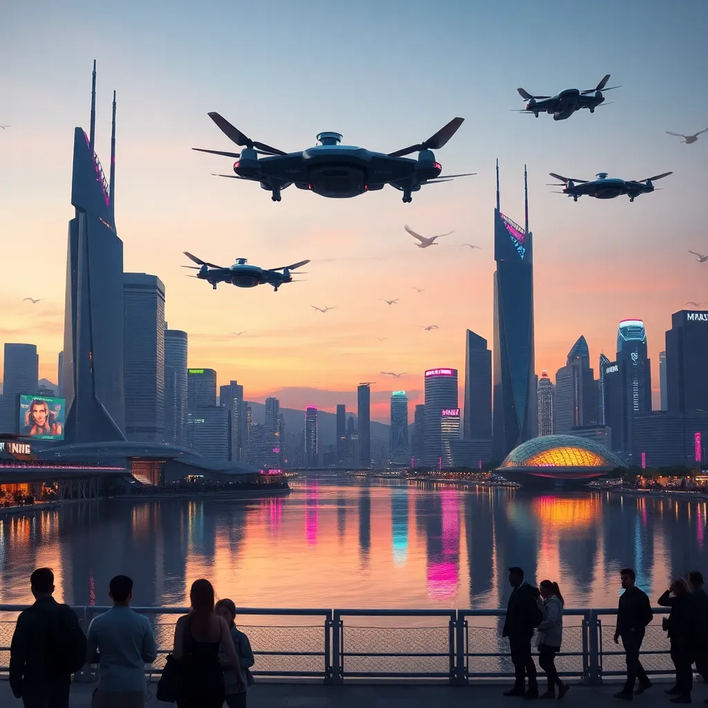 Imagine a futuristic cityscape at dusk, with towering skyscrapers and neon lights reflecting off a calm ocean. The air is filled with hovering drones and flying cars, while humans and robots coexist in harmony. Generate an image that captures the vibrant colors and sense of wonder in this futuristic world.