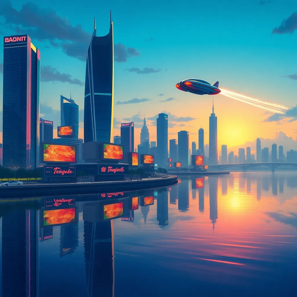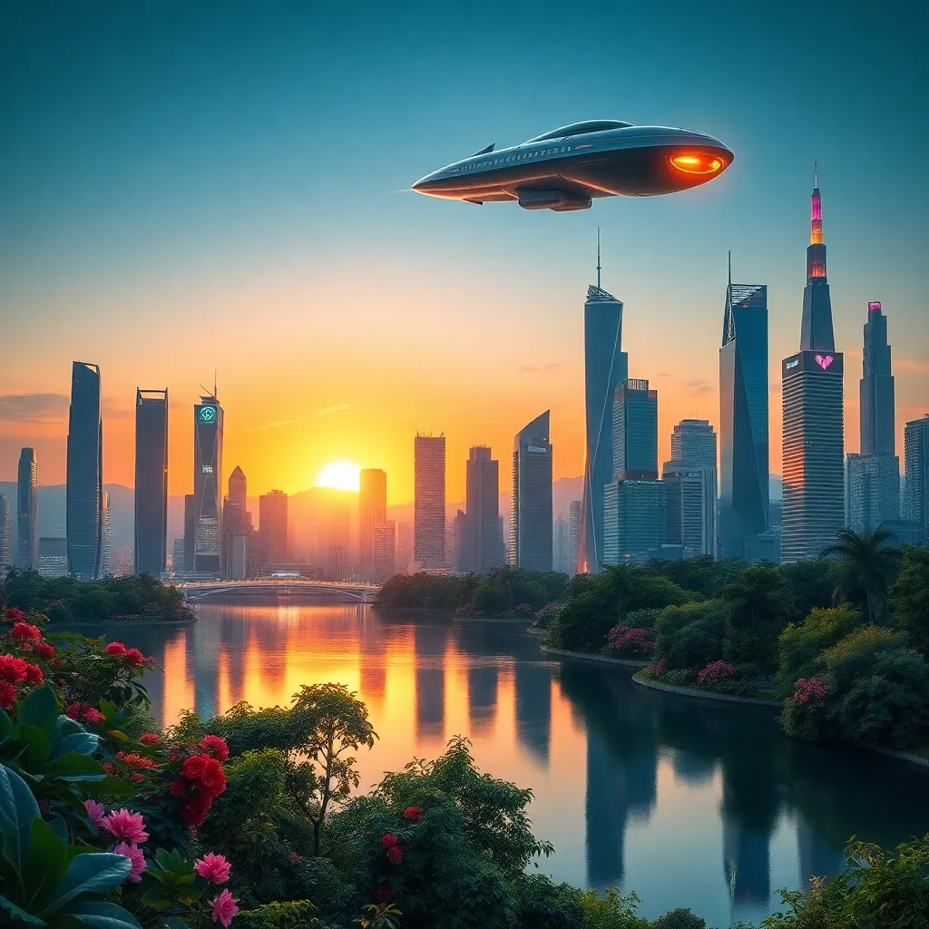 Create a futuristic cityscape at sunset, with towering skyscrapers and neon lights reflecting off a serene lake. Incorporate a sleek, silver spaceship hovering above the city, emitting a warm glow. Blend organic and synthetic elements, with lush greenery and vibrant flowers surrounding the urban landscape.
