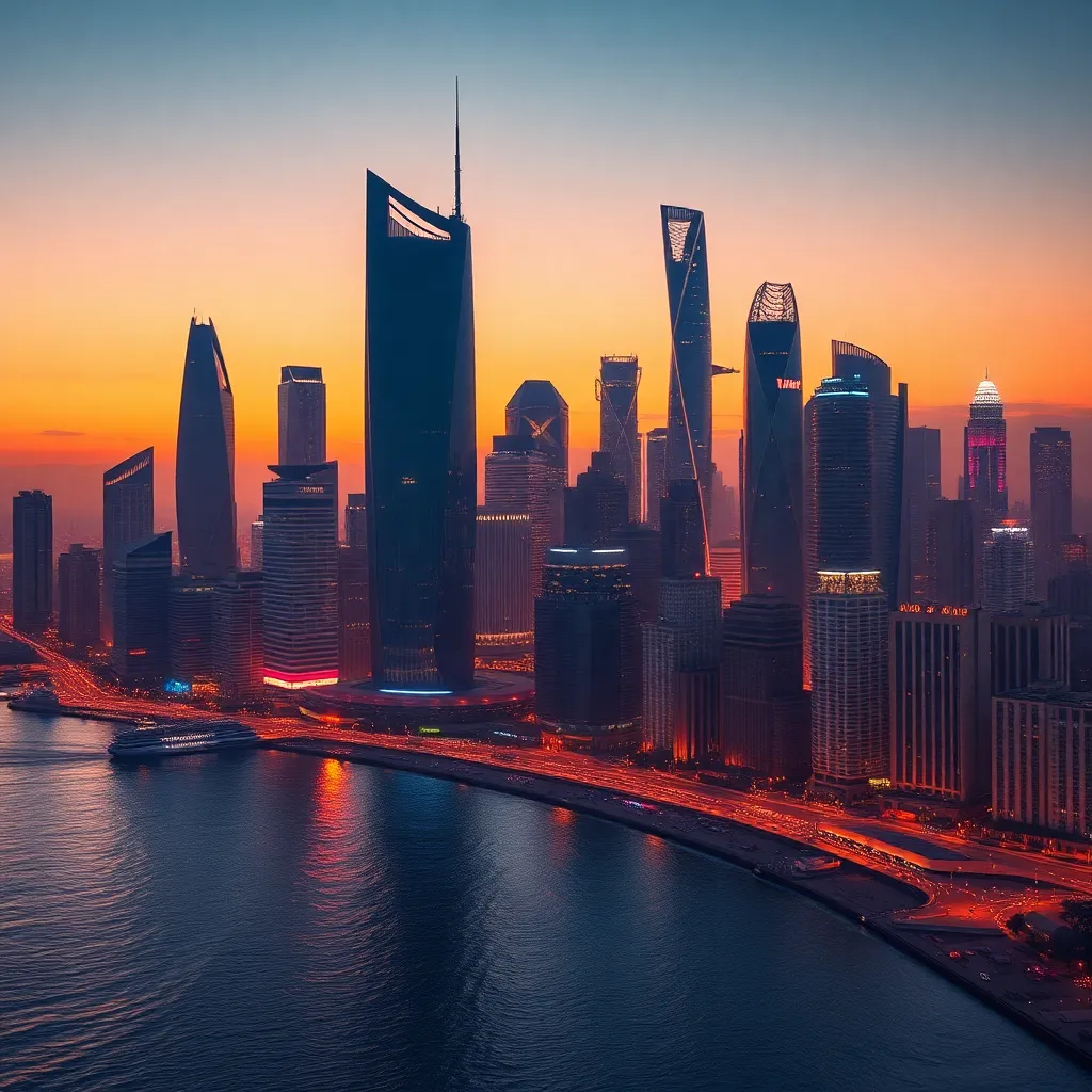 Create a futuristic cityscape at dusk, with sleek skyscrapers and neon lights reflecting off a calm ocean. Incorporate a sprawling metropolis with towering architecture, a bustling waterfront, and a vibrant atmosphere. Focus on warm colors and bold textures to capture the essence of a thriving urban metropolis.