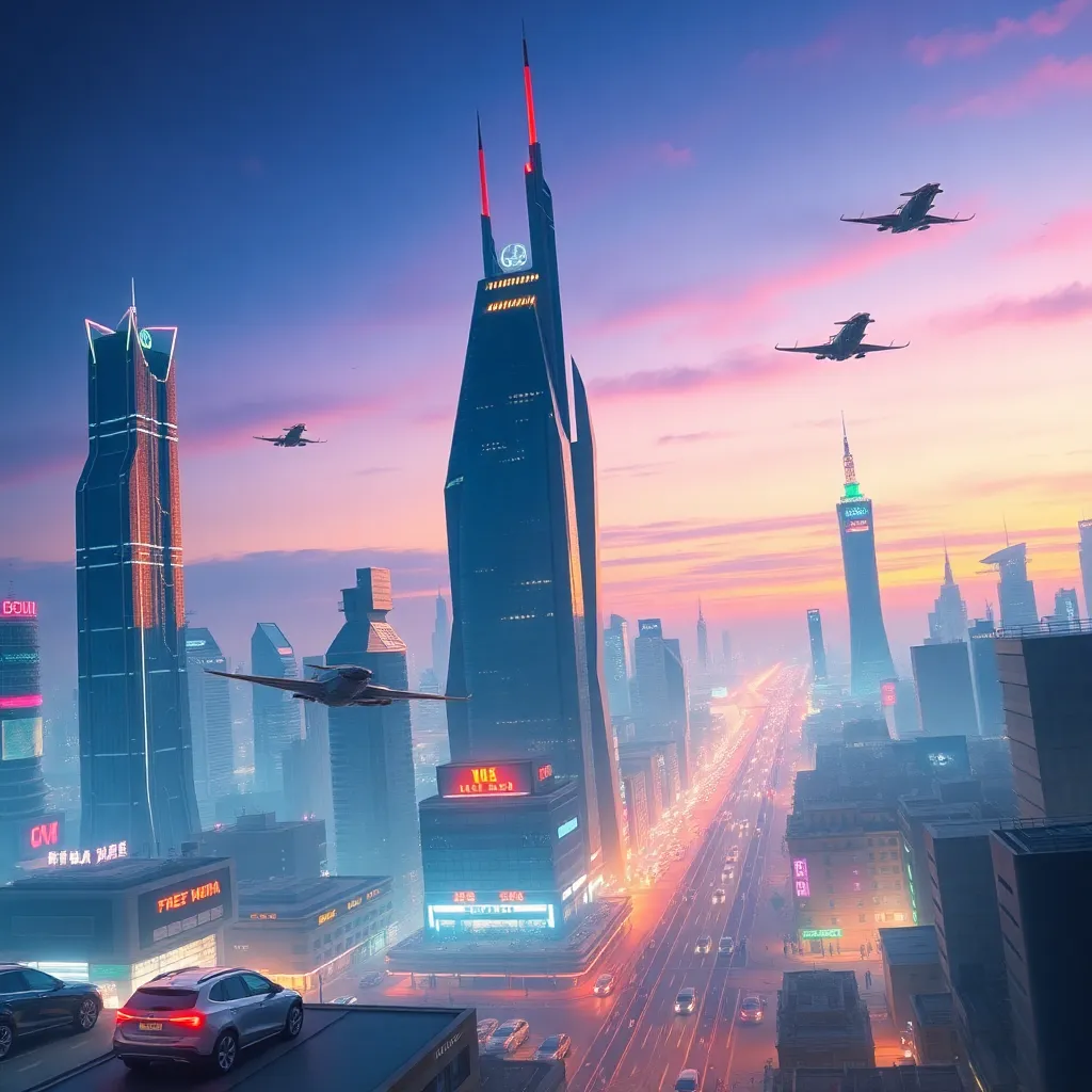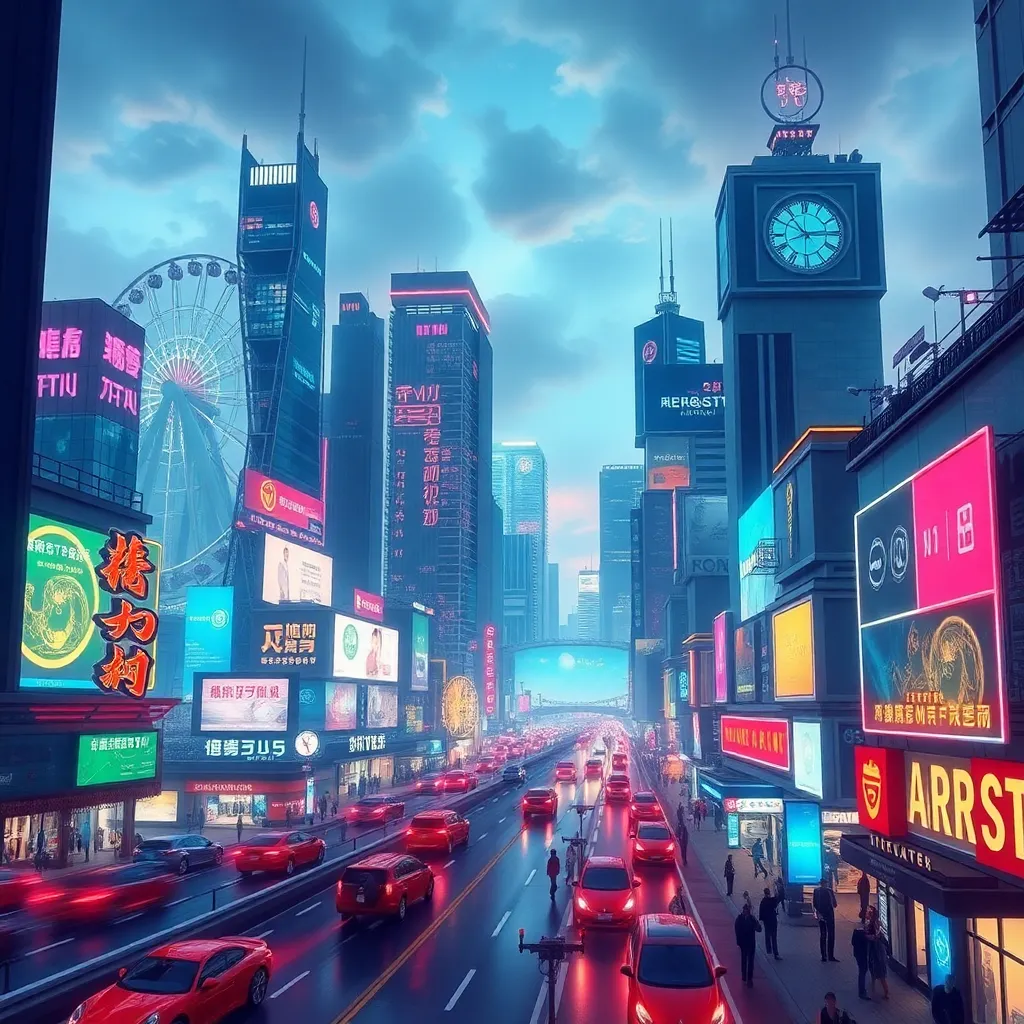 "Imagine a futuristic metropolis with sleek skyscrapers, flying cars, and a vibrant nightlife. Incorporate neon lights, holographic advertisements, and a bustling streetscape. Include a prominent city landmark, such as a towering Ferris wheel or a futuristic clock tower. Capture the city's energy and innovation.