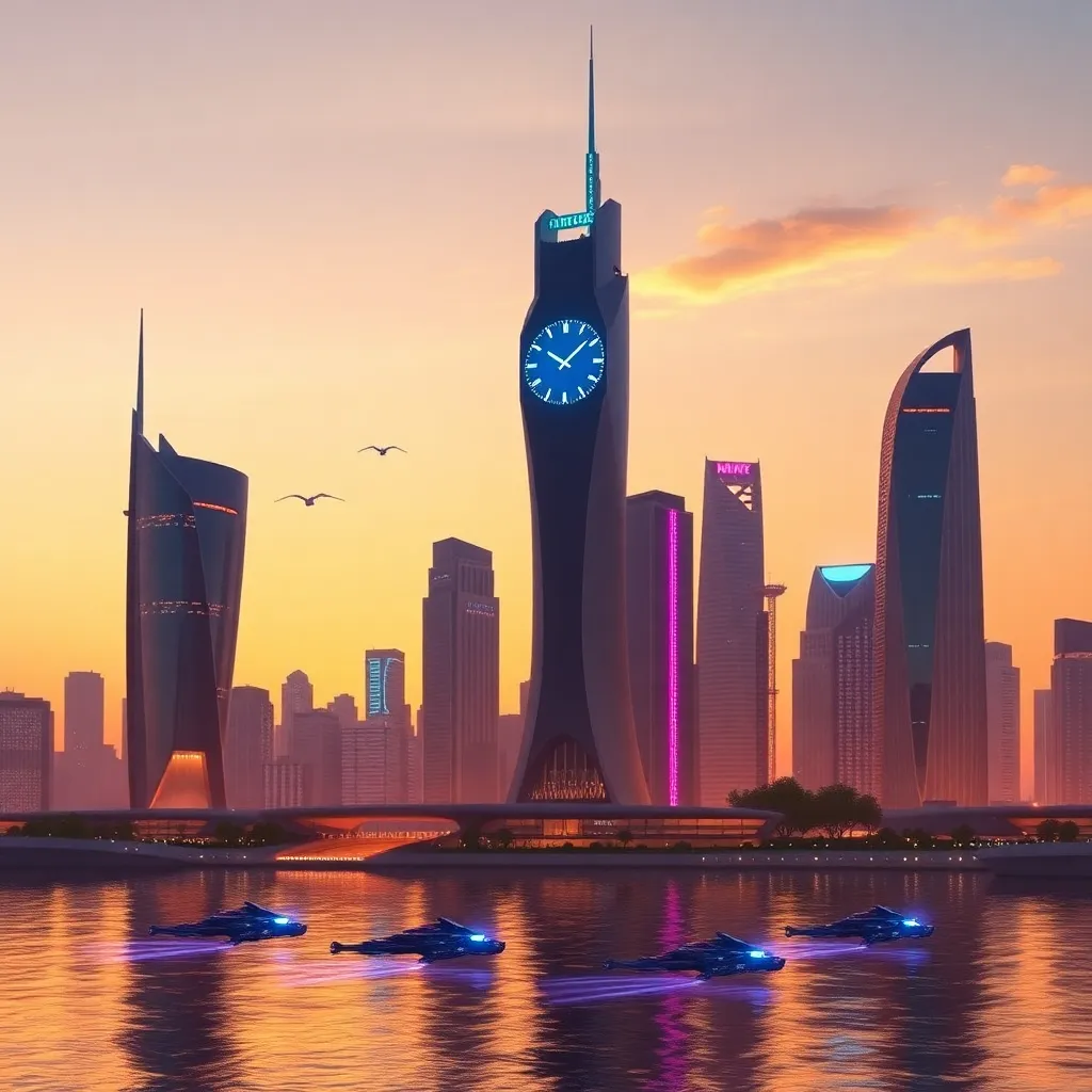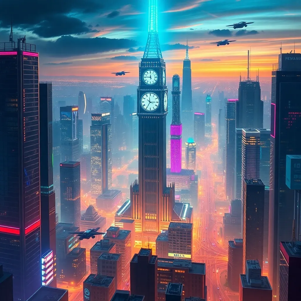 Generate an futuristic cityscape with towering skyscrapers and neon lights. The city is surrounded by a sprawling metropolis with flying cars zipping by. In the center, a massive clock tower rises above the rest, with a glowing blue light emanating from its peak. Incorporate vibrant colors and a sense of movement.