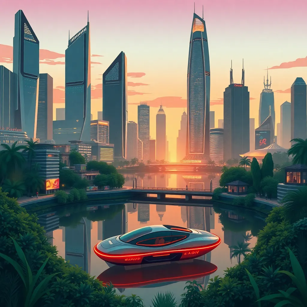 Create an illustration of a futuristic cityscape at dusk, with sleek skyscrapers and neon lights reflecting off a serene lake. Incorporate a hovercraft or flying car in the foreground, surrounded by lush greenery and vibrant street art. The atmosphere should be futuristic yet peaceful, with a warm orange glow.