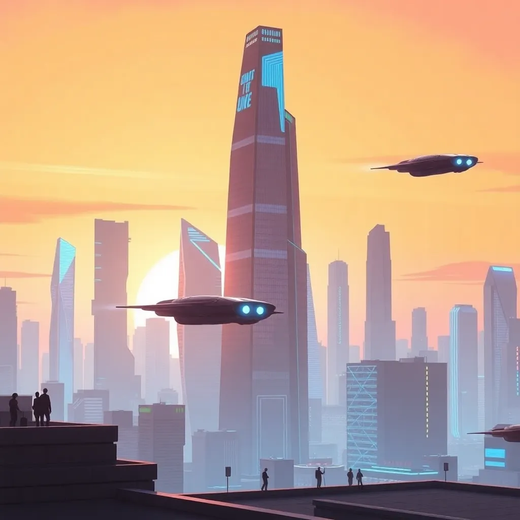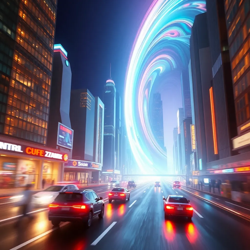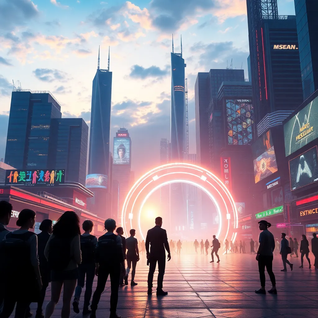 Imagine a futuristic cityscape at sunset, with sleek skyscrapers and flying cars zipping by. In the foreground, a group of people in futuristic attire are gathered around a large, glowing portal. The atmosphere is vibrant and energetic, with neon lights and holographic advertisements illuminating the night sky.