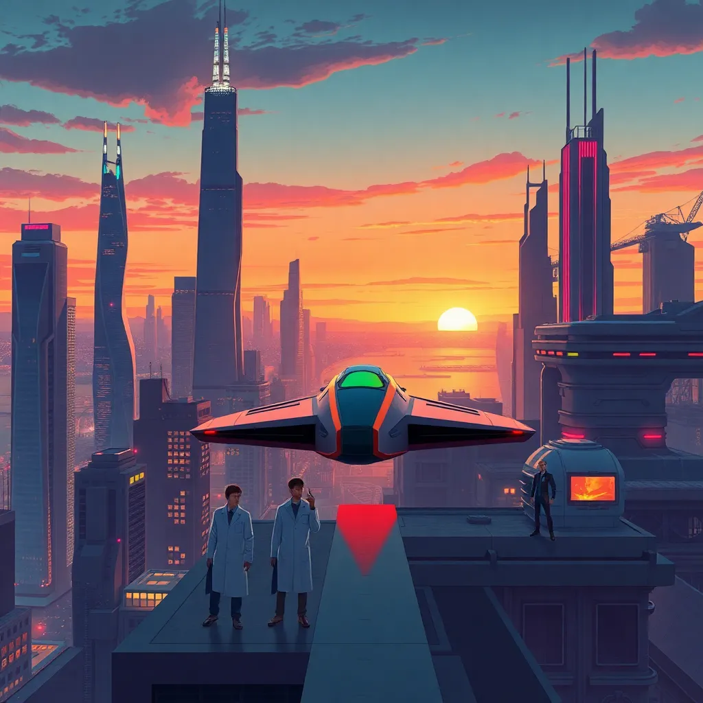 Create an illustration of a futuristic cityscape at sunset, with towering skyscrapers and neon lights reflecting off the water. Incorporate a sleek, high-tech spacecraft landing on the rooftop, surrounded by scientists in lab coats, and a subtle hint of a futuristic transportation system in the background.