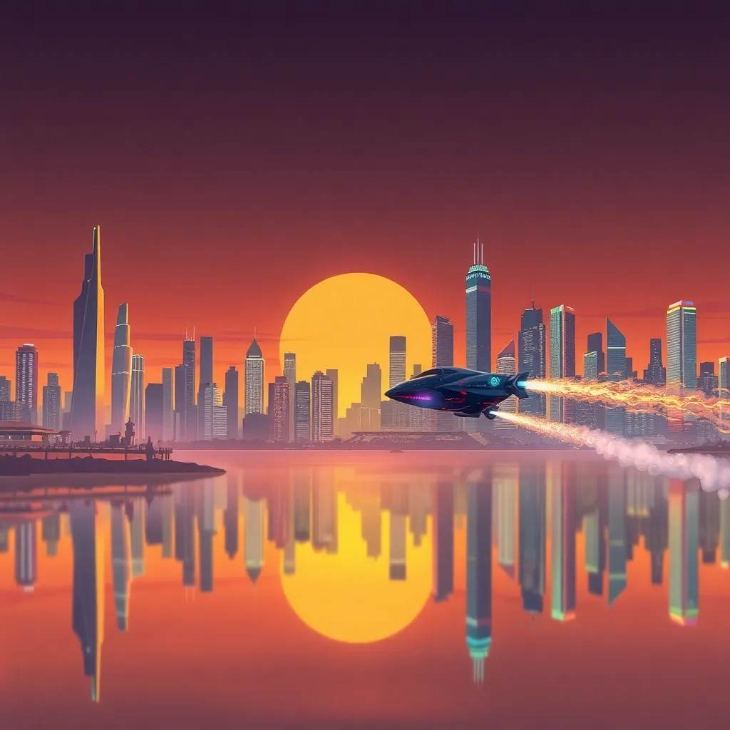 Create an illustration of a futuristic cityscape at sunset, with sleek skyscrapers and neon-lit billboards reflecting off the calm waters of a nearby lake. Incorporate a hovercraft flying overhead, leaving a trail of sparks and smoke. The atmosphere should be vibrant and energetic, with a hint of mystery.