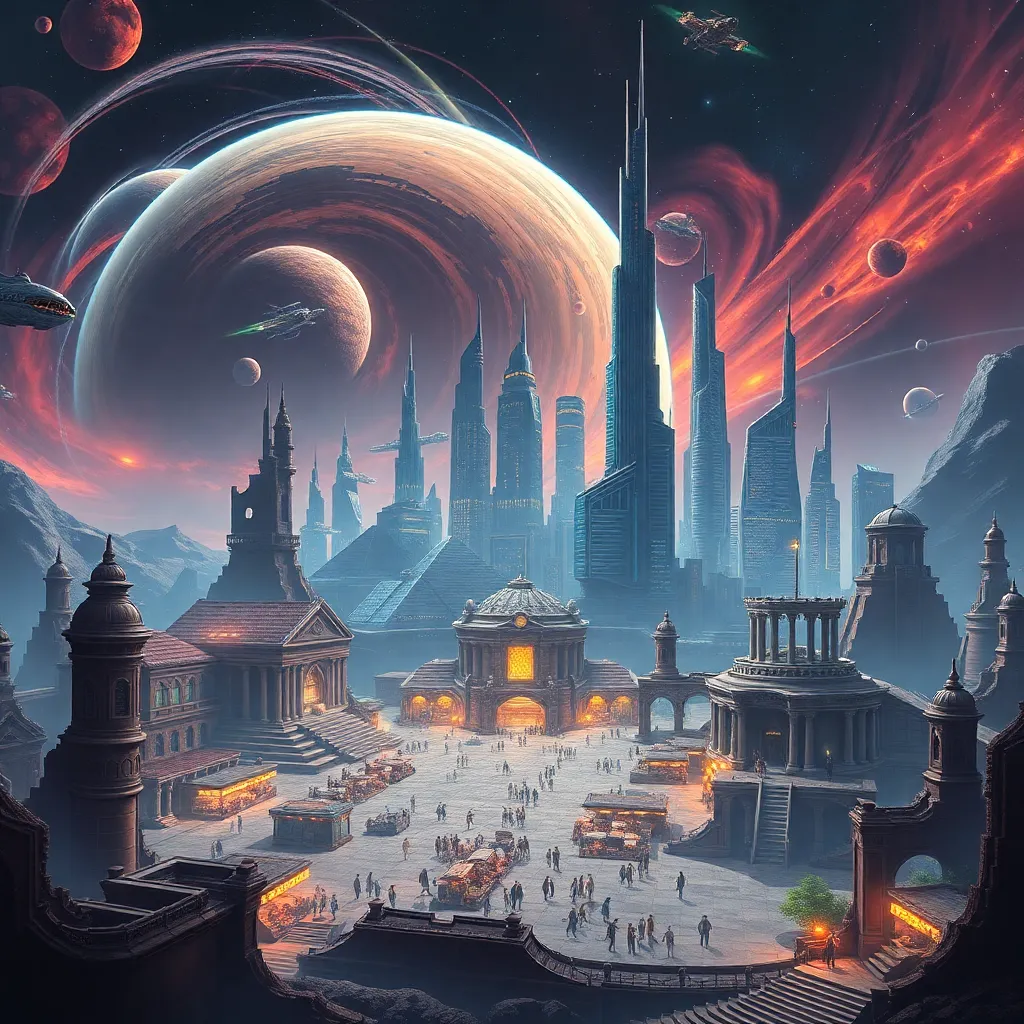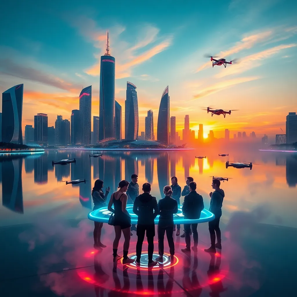 Imagine a futuristic cityscape at dusk, with sleek skyscrapers and neon lights reflecting off the wet pavement. A group of people in futuristic attire are gathered around a glowing portal, surrounded by holographic advertisements and flying drones. The air is filled with the hum of technology and the scent of street food.