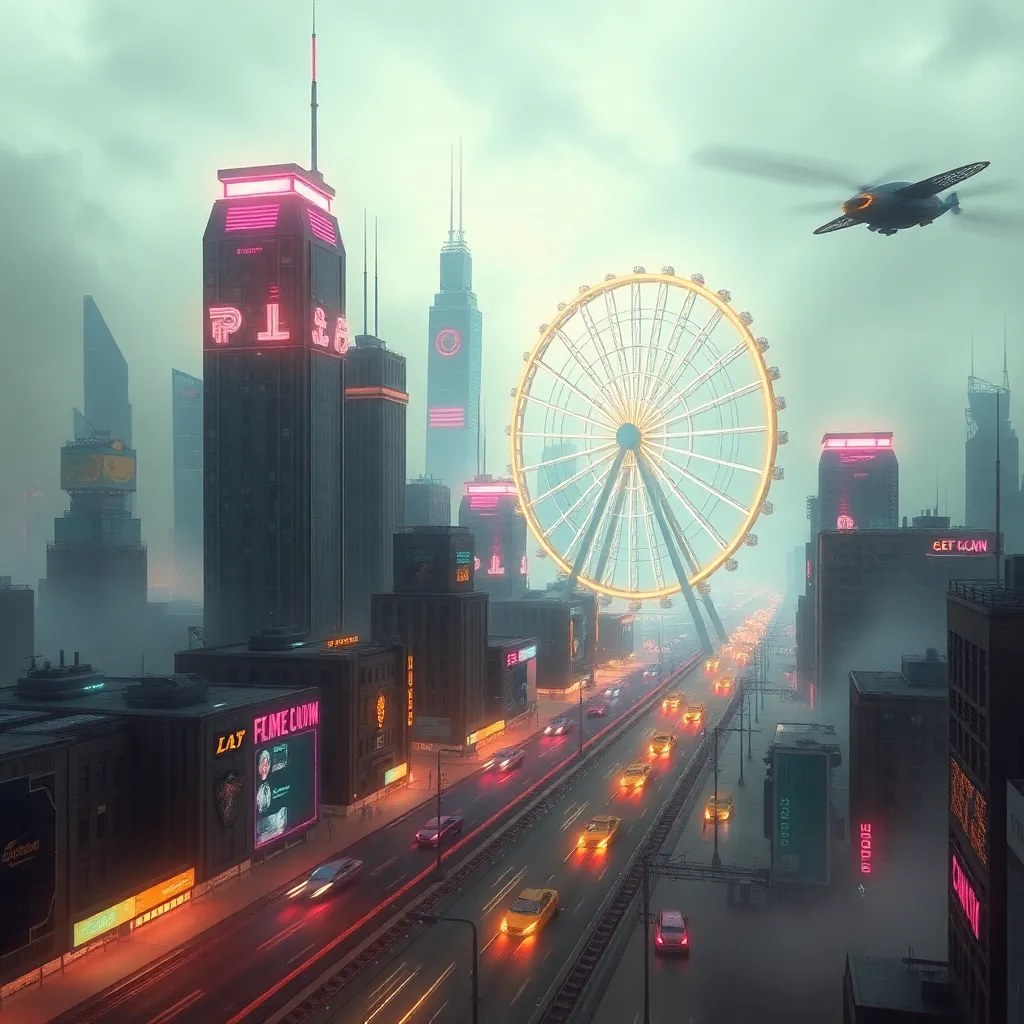 Design a futuristic cityscape with towering skyscrapers, neon-lit streets, and flying cars zipping by. Incorporate a giant, glowing Ferris wheel as the city's iconic landmark. The atmosphere should be vibrant and energetic, with a hint of retro-futurism. The city should be surrounded by a misty, polluted environment.