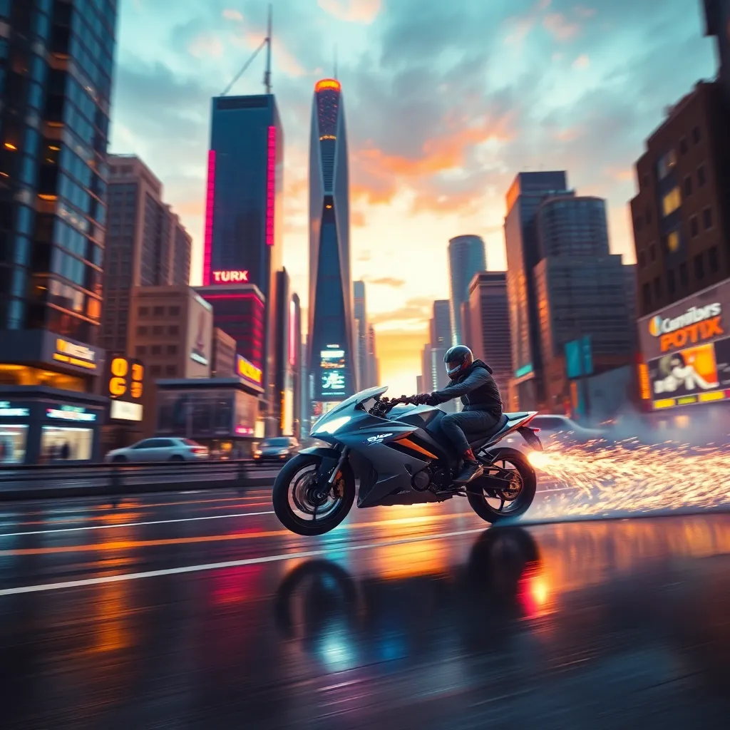 Create an illustration of a futuristic cityscape at sunset, with sleek skyscrapers and neon lights reflecting off a calm, futuristic lake. Incorporate a hoverbike soaring above the city, leaving a trail of sparks and smoke behind. The atmosphere should be vibrant, with a sense of excitement and adventure.