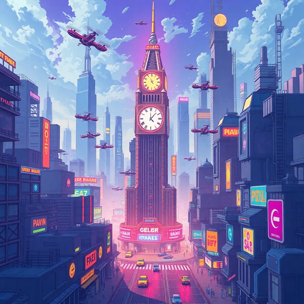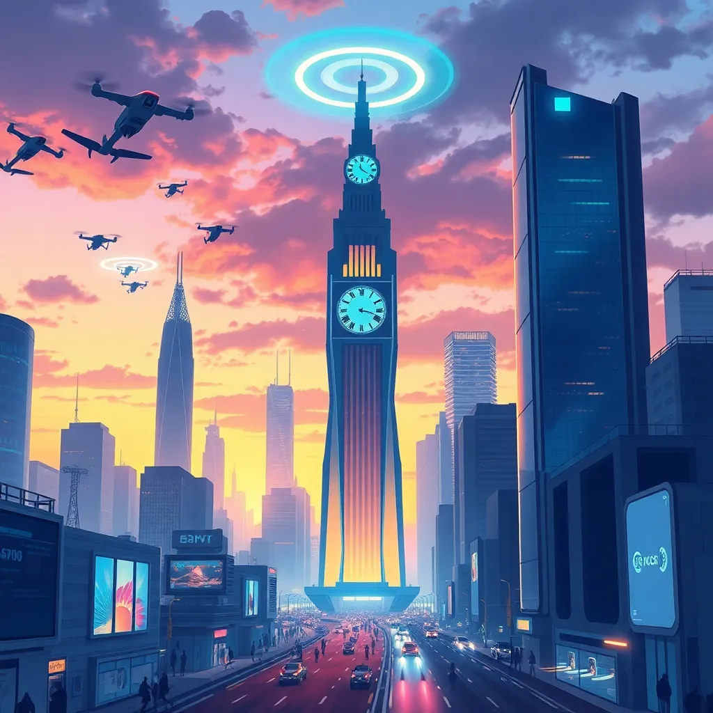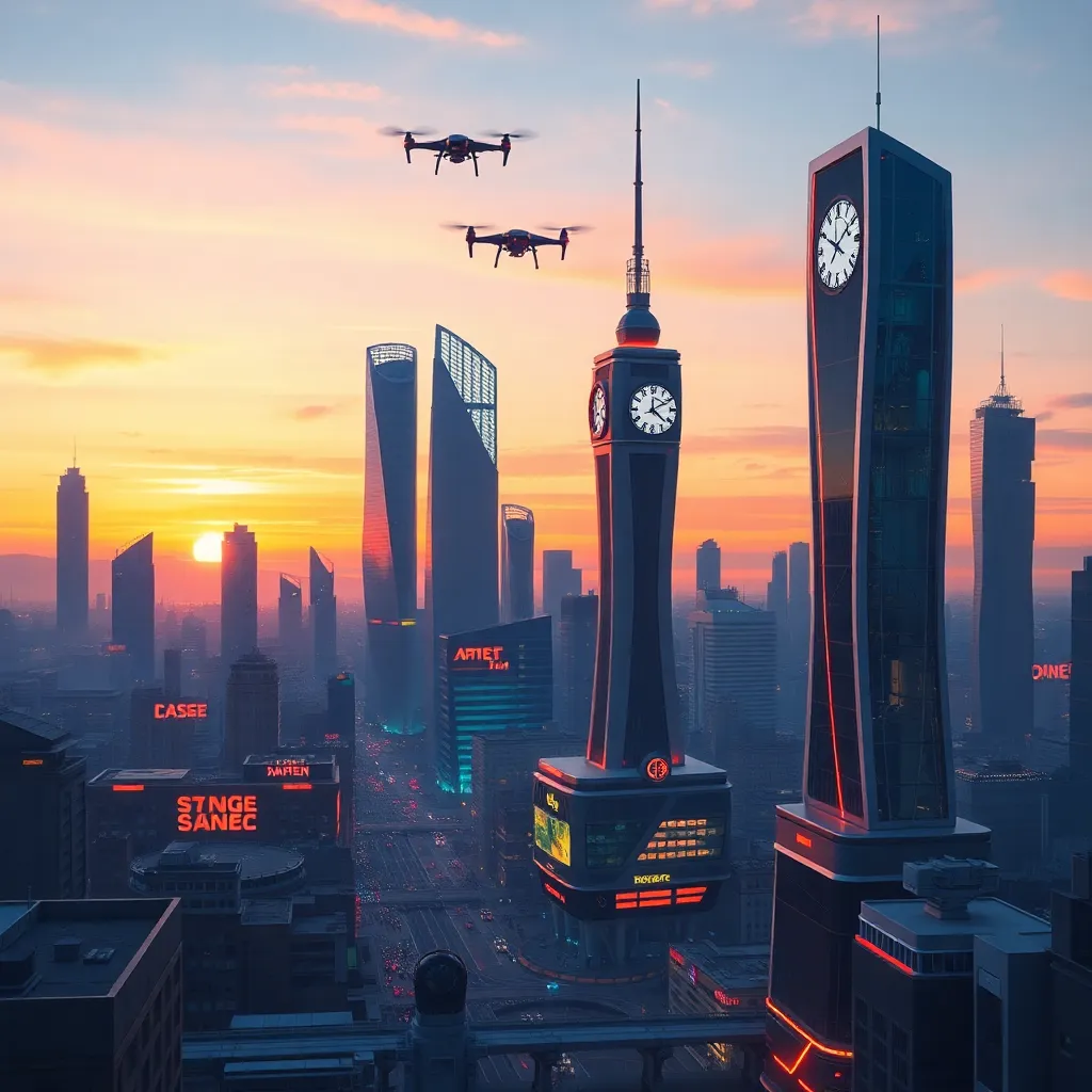 Create an illustration of a futuristic cityscape with towering skyscrapers, neon lights, and a bustling streetscape. Incorporate a prominent clock tower with a glowing face, surrounded by flying drones and hovercars. The atmosphere should be vibrant and energetic, with a hint of nostalgia and retro-futism."u