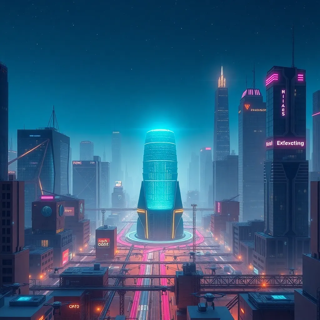 Imagine a futuristic cityscape with sleek skyscrapers and neon lights. In the center, a massive flux capacitor glows with an otherworldly energy. Surrounding it, a swarm of tiny robots and drones are repairing and upgrading the city's infrastructure. The sky is a deep shade of indigo, with stars twinkling in the distance.