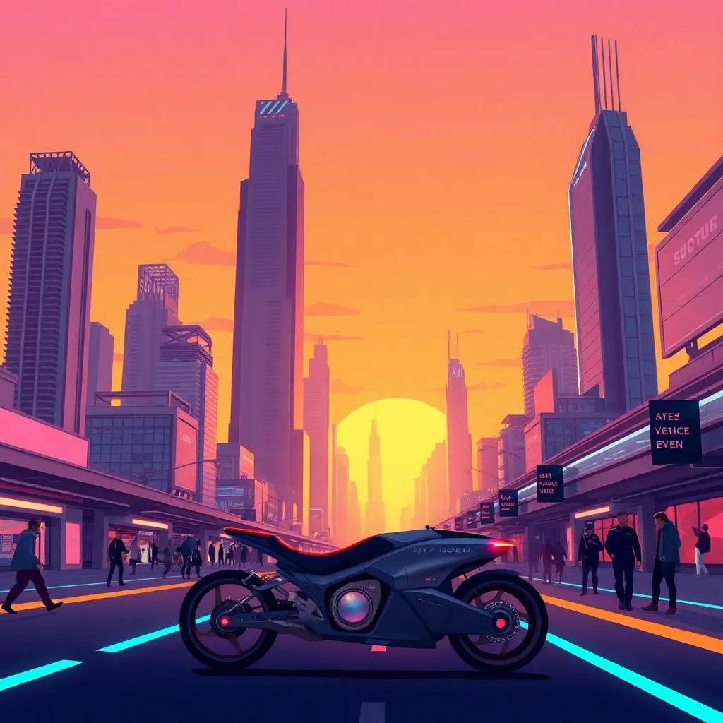 Create an illustration of a futuristic cityscape at sunset, with towering skyscrapers and sleek architecture. The sky is a warm orange hue with subtle purple undertones. In the foreground, a hoverbike is parked on a sleek, neon-lit street, surrounded by bustling pedestrians. Incorporate subtle sci-fi elements and vibrant colors.