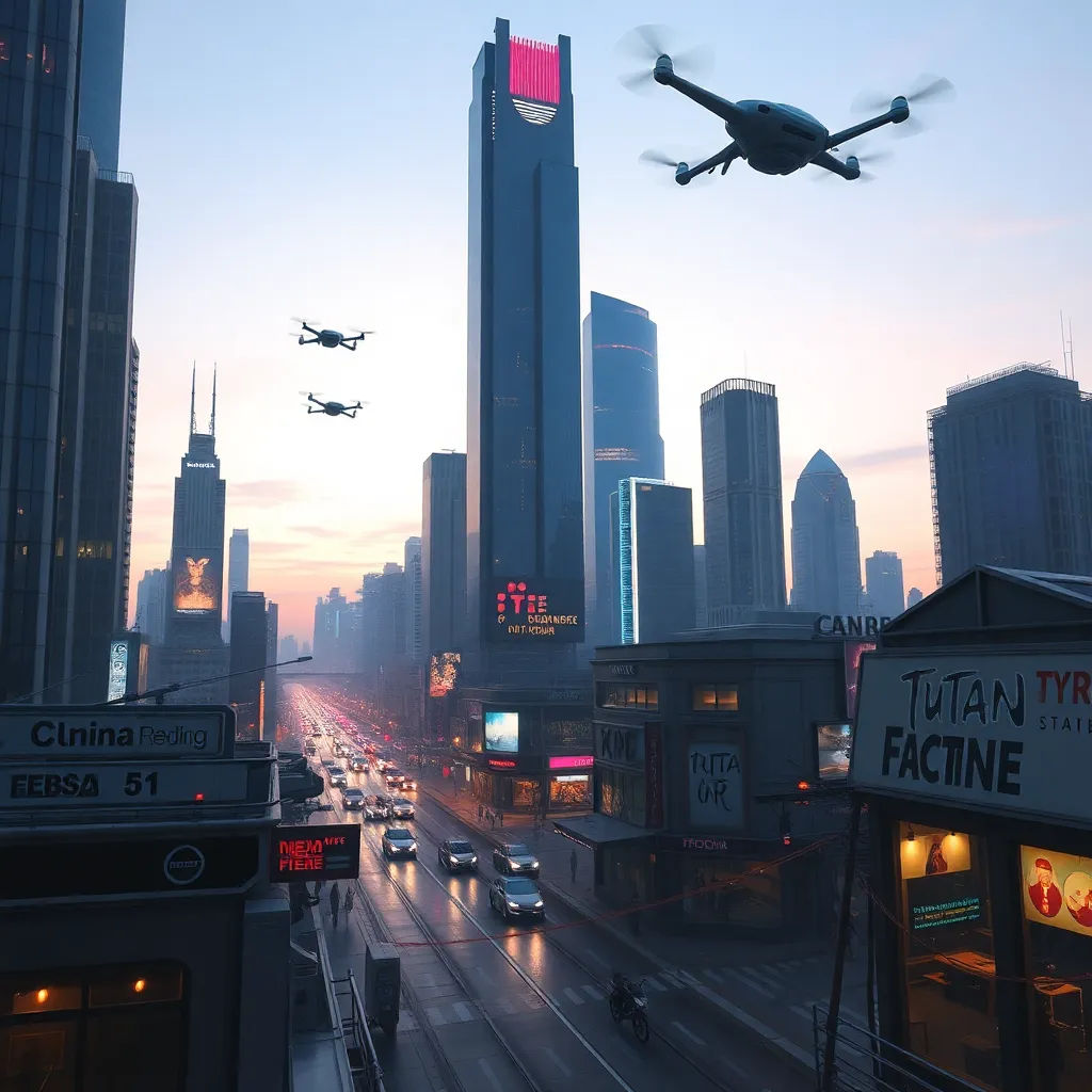 Create an image of a futuristic cityscape at dusk, with towering skyscrapers and neon-lit streets. Incorporate a sense of movement and energy, with hovercars and flying drones zipping through the air. The city should be bustling with activity, with people from all walks of life going about their daily lives.