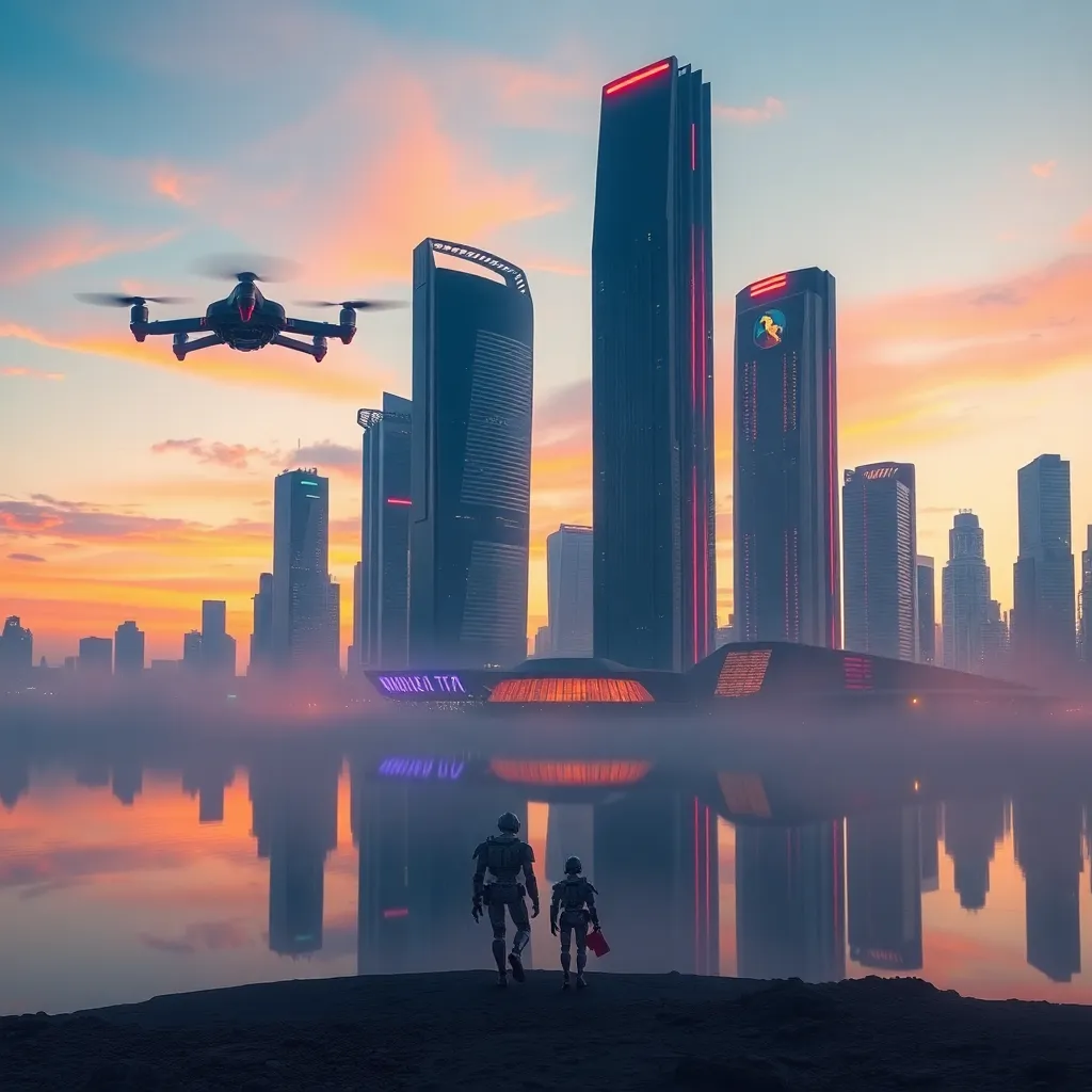 Create a futuristic cityscape at sunset, with sleek skyscrapers and neon lights reflecting off a serene lake. Incorporate a hovering drone, a pair of robotic figures walking towards the city, and a subtle aura of mist surrounding the scene. Blend vibrant colors and subtle textures to evoke a sense of wonder.