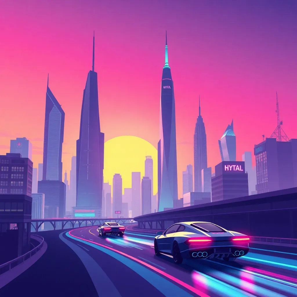 Create an illustration of a futuristic cityscape at sunset, with sleek skyscrapers and flying cars zipping by. Incorporate a vibrant purple hue and subtle neon accents. The atmosphere should be energetic and dynamic, with a sense of movement and possibility. Generate an image that captures the thrill of innovation and progress.