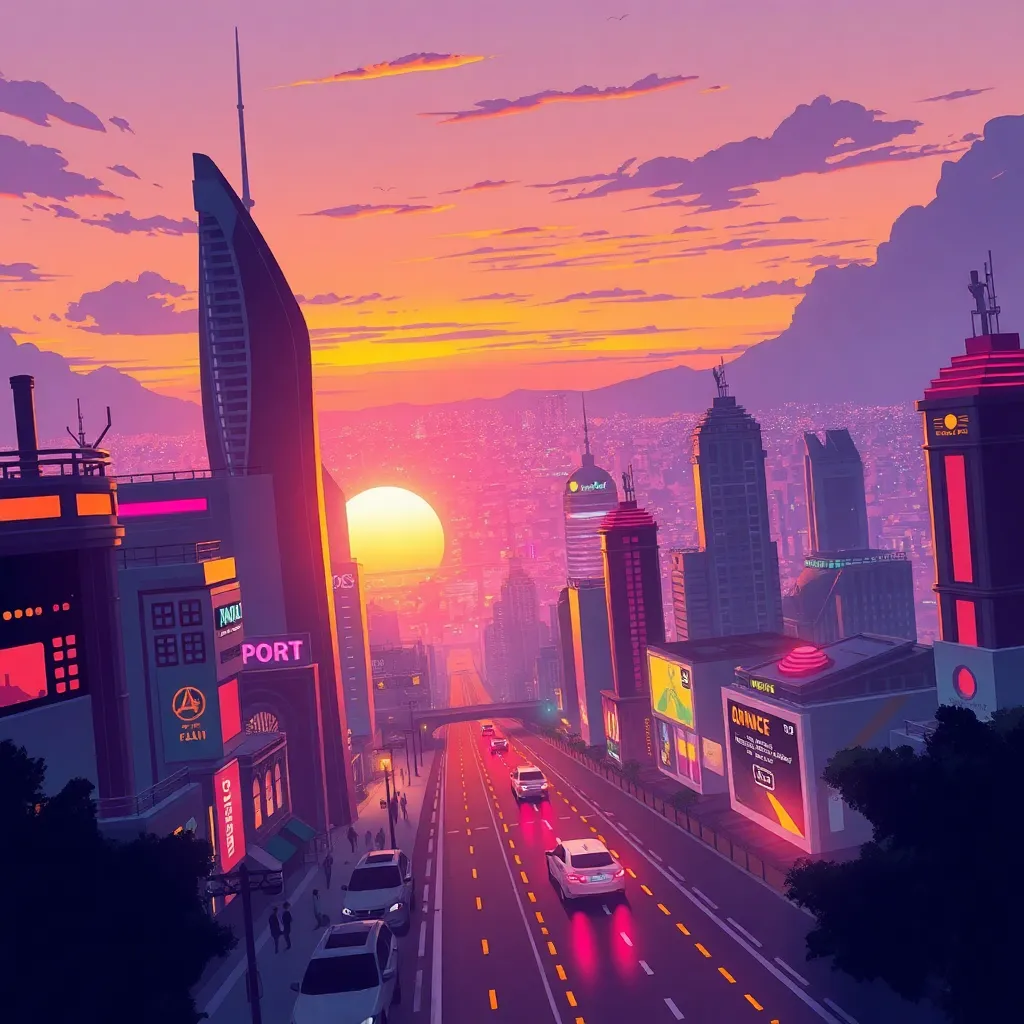Create an illustration of a futuristic cityscape at sunset, with sleek skyscrapers, neon lights, and a sprawling metropolis in the distance. Incorporate a sense of movement and energy, with people and vehicles zipping by. Blend futuristic and organic elements, with a warm orange and purple color palette.