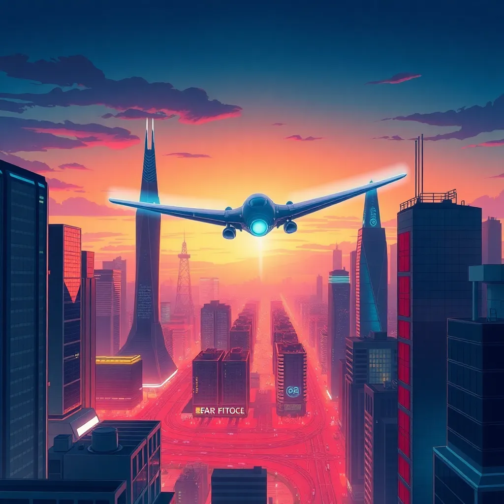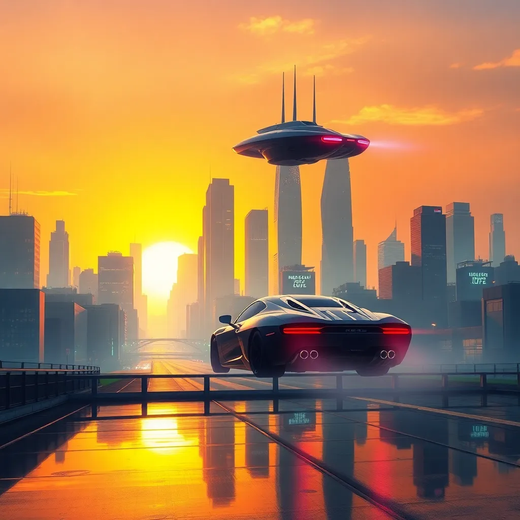 Create an image of a futuristic cityscape at sunset, with sleek skyscrapers and neon-lit streets. Incorporate a flying car or drone hovering above the scene, with a majestic mountain range in the background. Add vibrant colors and a sense of dynamic energy to capture the essence of innovation and progress.