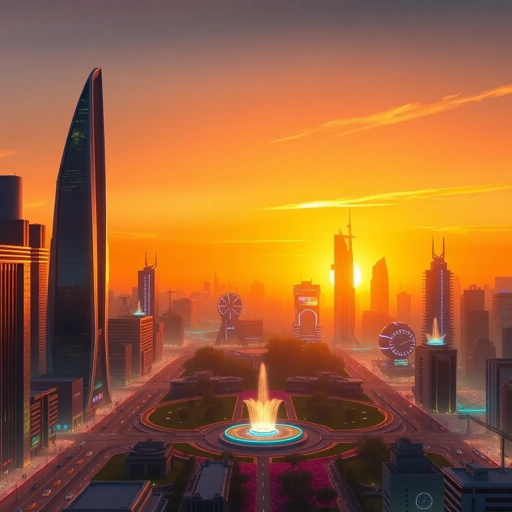 Create a futuristic cityscape at sunset, with sleek skyscrapers and neon-lit streets. Incorporate a central park with a large, glowing tree and a fountain. The sky should be a warm orange-yellow color with a few wispy clouds. The city should feel vibrant and alive, with a sense of hope and possibility.