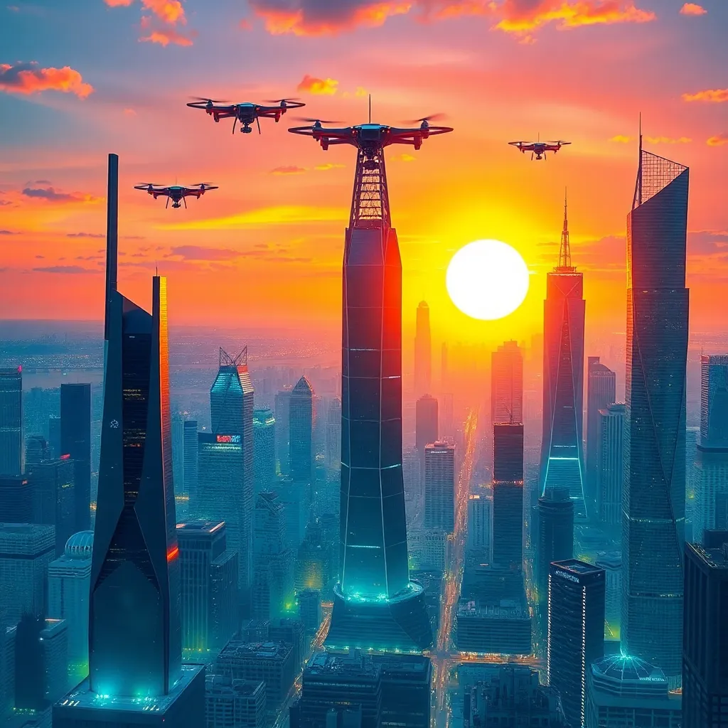 Create an image of a futuristic cityscape at sunset, with sleek skyscrapers and hovering drones, amidst a sprawling metropolis. Incorporate vibrant colors, intricate details, and a sense of grandeur. Include a subtle hint of artificial intelligence and technological advancements in the architecture and ambient lighting.