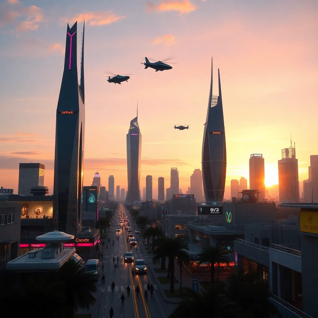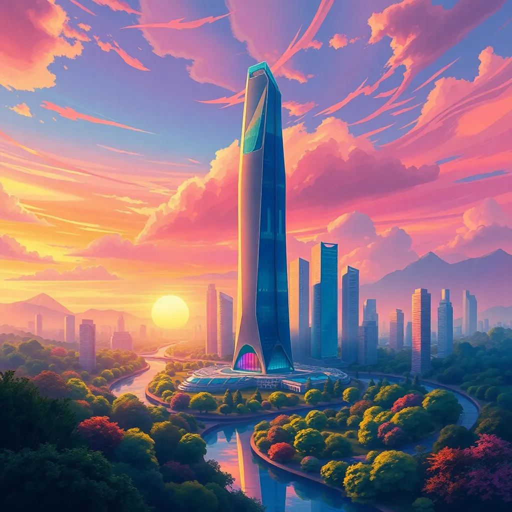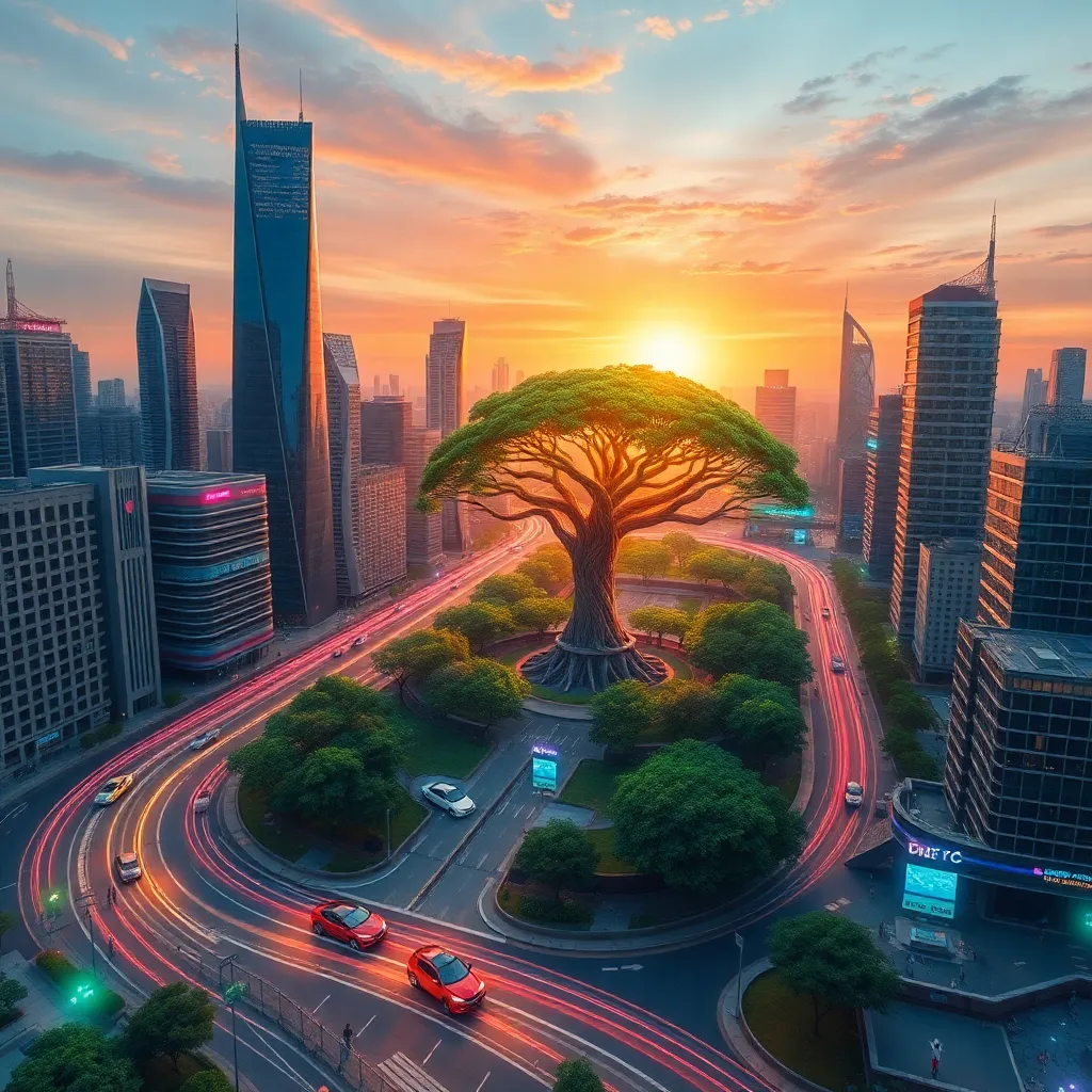 Envision a futuristic cityscape at sunset, with sleek skyscrapers and flying cars zipping by. Incorporate a central park with lush greenery and a large, glowing tree of life. Add a sprinkle of magic with wispy, colorful auras surrounding the city's inhabitants. Generate an image that embodies innovation and harmony.