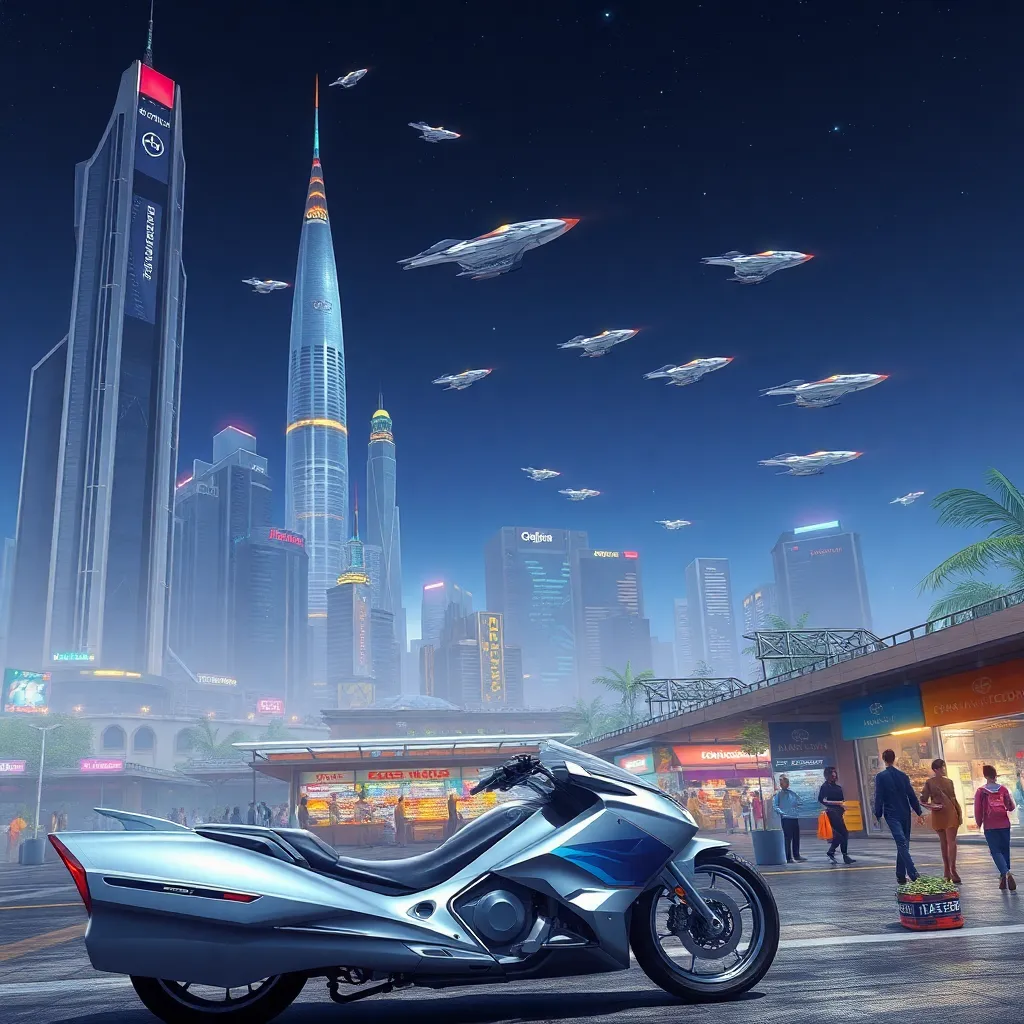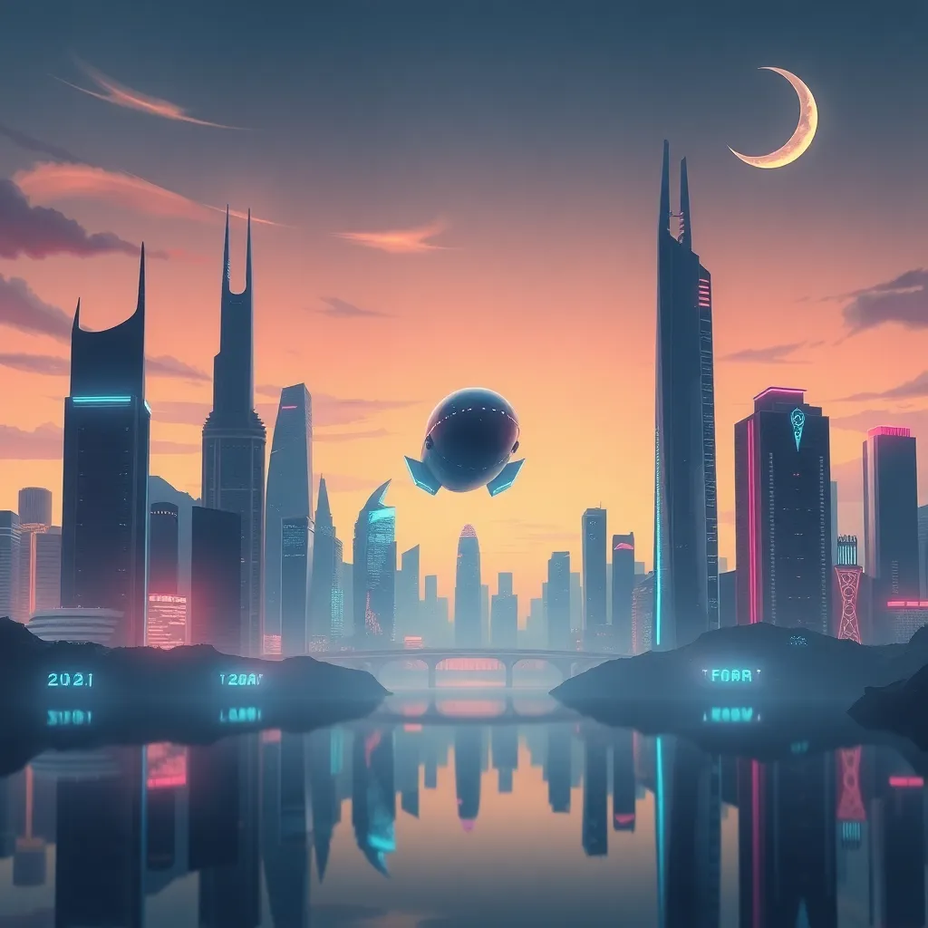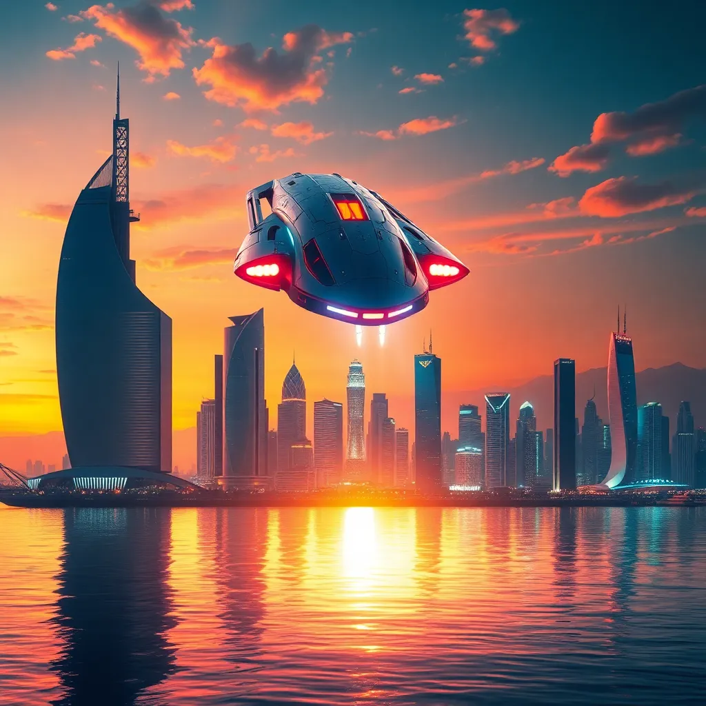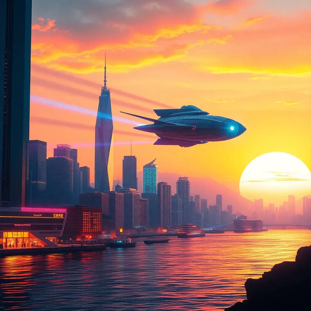 Imagine a futuristic cityscape at sunset, with sleek skyscrapers and neon lights reflecting off a calm ocean. A sleek, silver spaceship descends from the sky, casting a warm glow on the city below. Incorporate vibrant colors and intricate details, blending futuristic and natural elements in harmony.