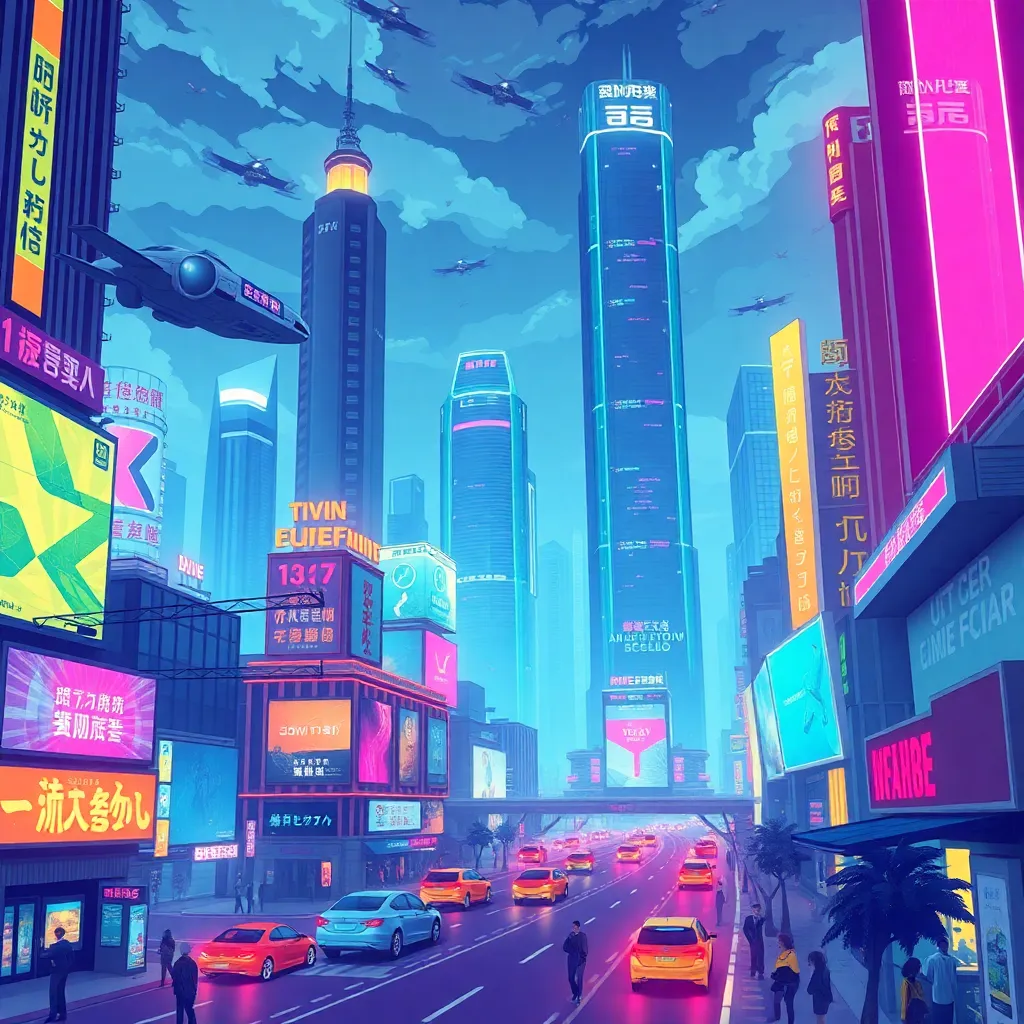 Create an illustration of a futuristic cityscape with towering skyscrapers, flying cars, and a vibrant atmosphere. Incorporate neon lights, holographic advertisements, and a bustling street scene. The city should be set in a futuristic metropolis, with a focus on sustainability and innovation. Color palett