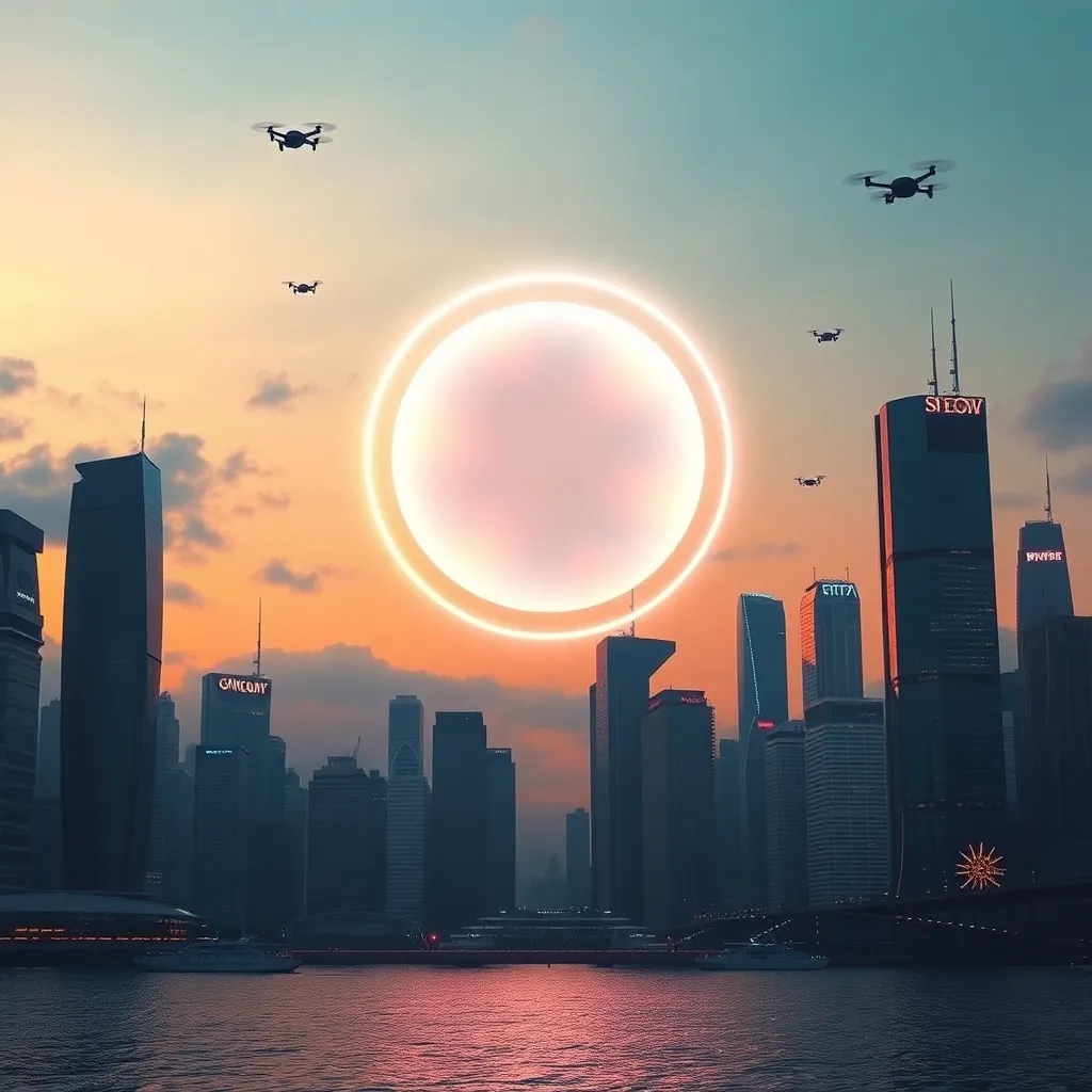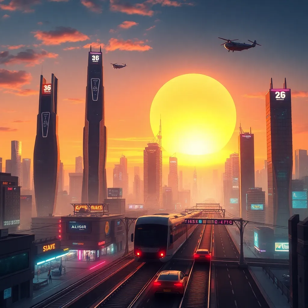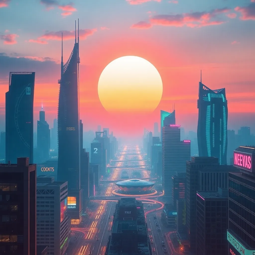 Create a futuristic cityscape at sunset, with sleek skyscrapers and neon-lit streets. Incorporate a large, glowing orb hovering above the city, surrounded by a halo of light. The atmosphere should be vibrant and energetic, with a sense of innovation and progress. Blend futuristic and retro elements for a unique look.