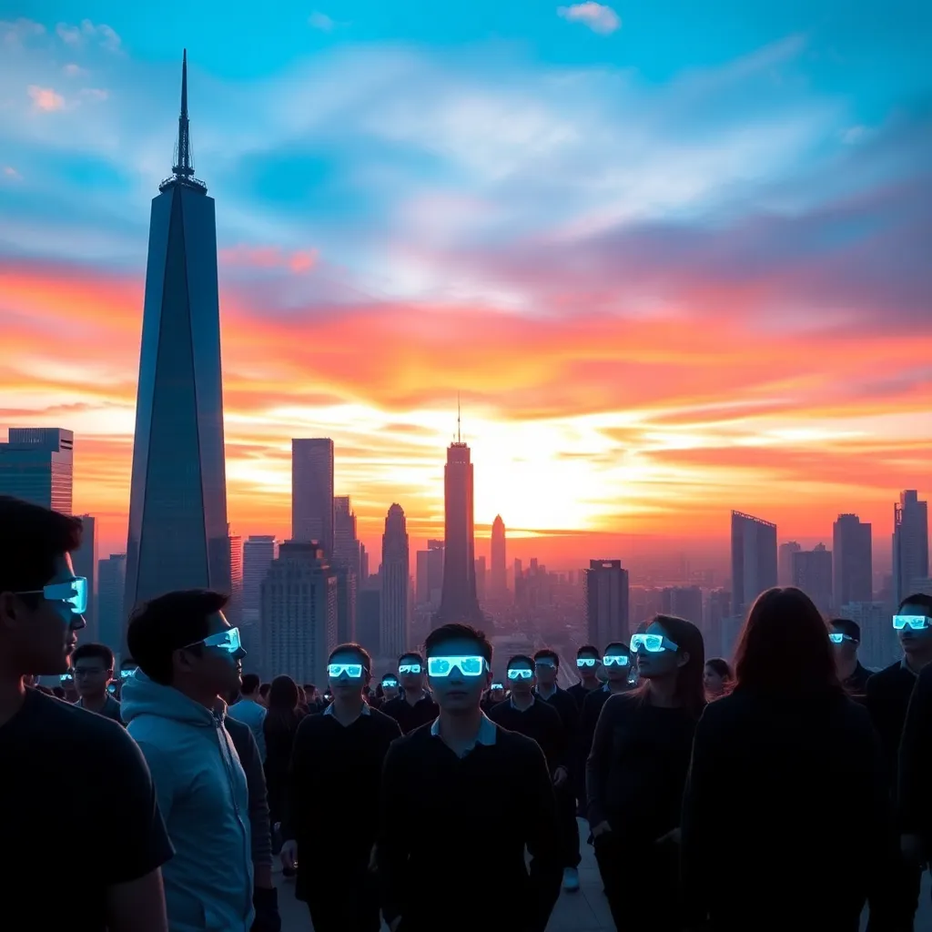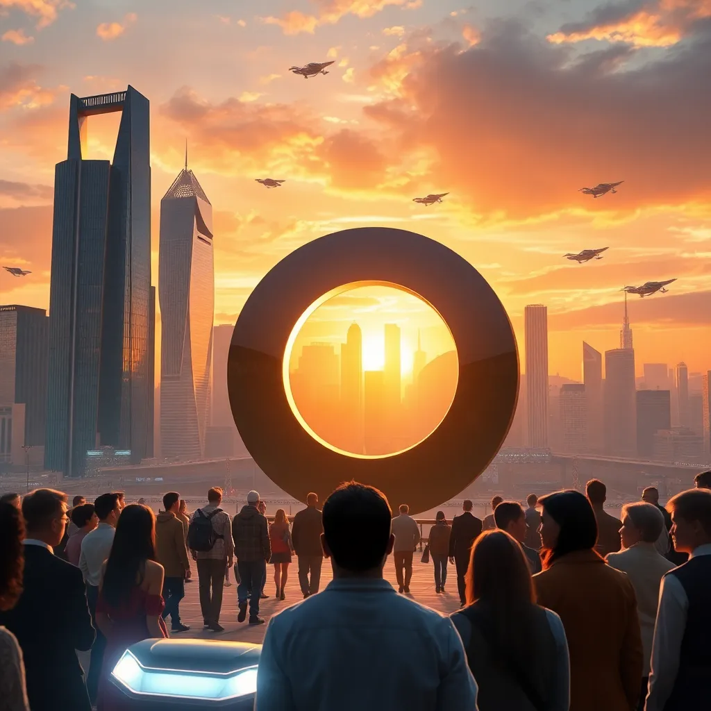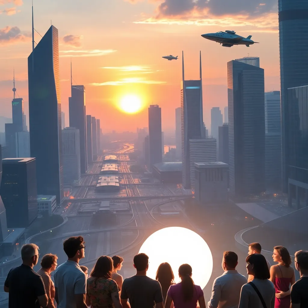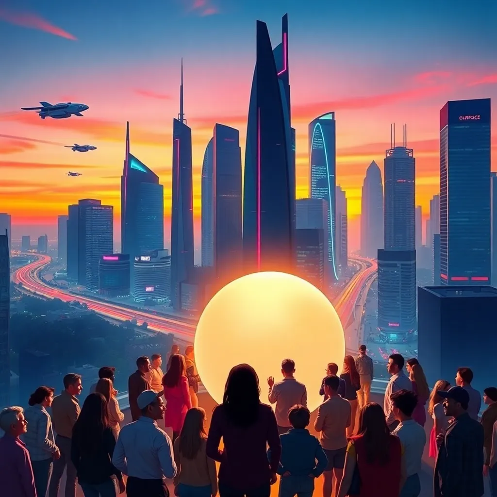 Create a futuristic cityscape at sunset, with sleek skyscrapers and flying cars zipping by. Incorporate vibrant colors and neon lights. In the foreground, a group of people from diverse backgrounds gather around a large, glowing orb, symbolizing unity and connection in a world of rapid technological advancement.