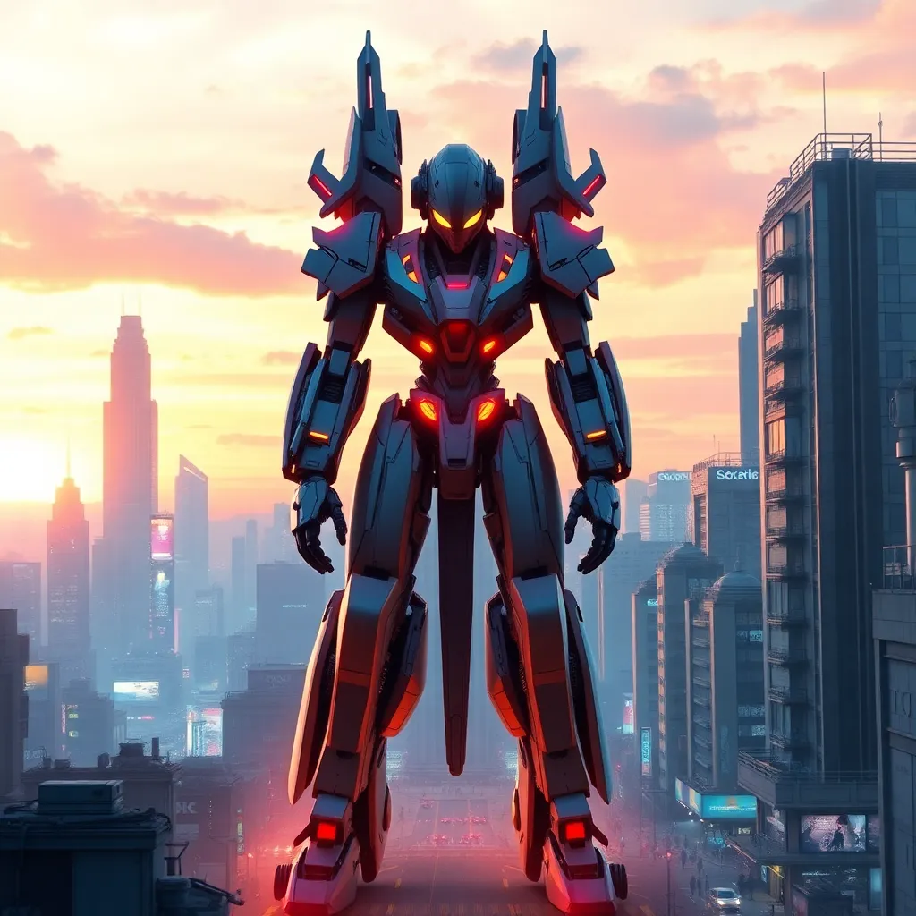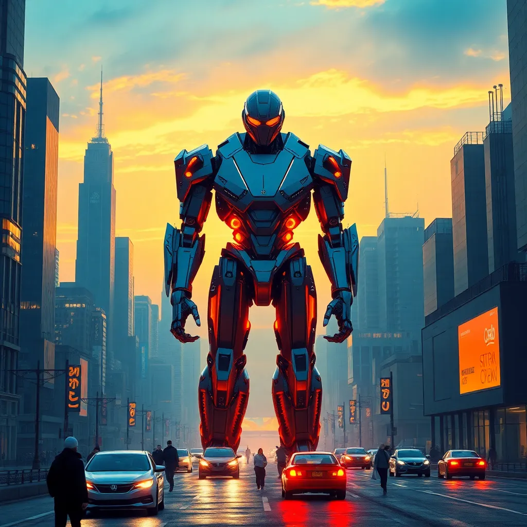 Imagine a futuristic cityscape at sunset, with towering skyscrapers and flying cars zipping by. In the center, a majestic robot stands tall, its metallic body glowing with a warm orange light. The city's inhabitants, both human and robotic, go about their daily lives, oblivious to the robot's grandeur