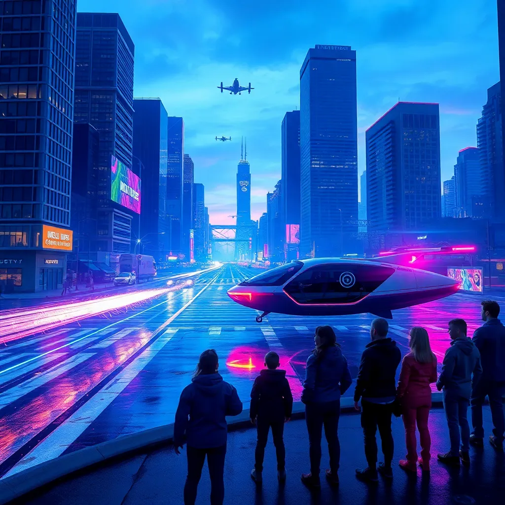 Envision a futuristic cityscape at dusk, with sleek skyscrapers and neon lights reflecting off the wet pavement. A hovercar zooms by, leaving a trail of sparks. In the foreground, a group of people in futuristic attire gather around a holographic display, marveling at the city's vibrant energy. Incorporate a mix of blues and purples to create a sense of depth and mystery.