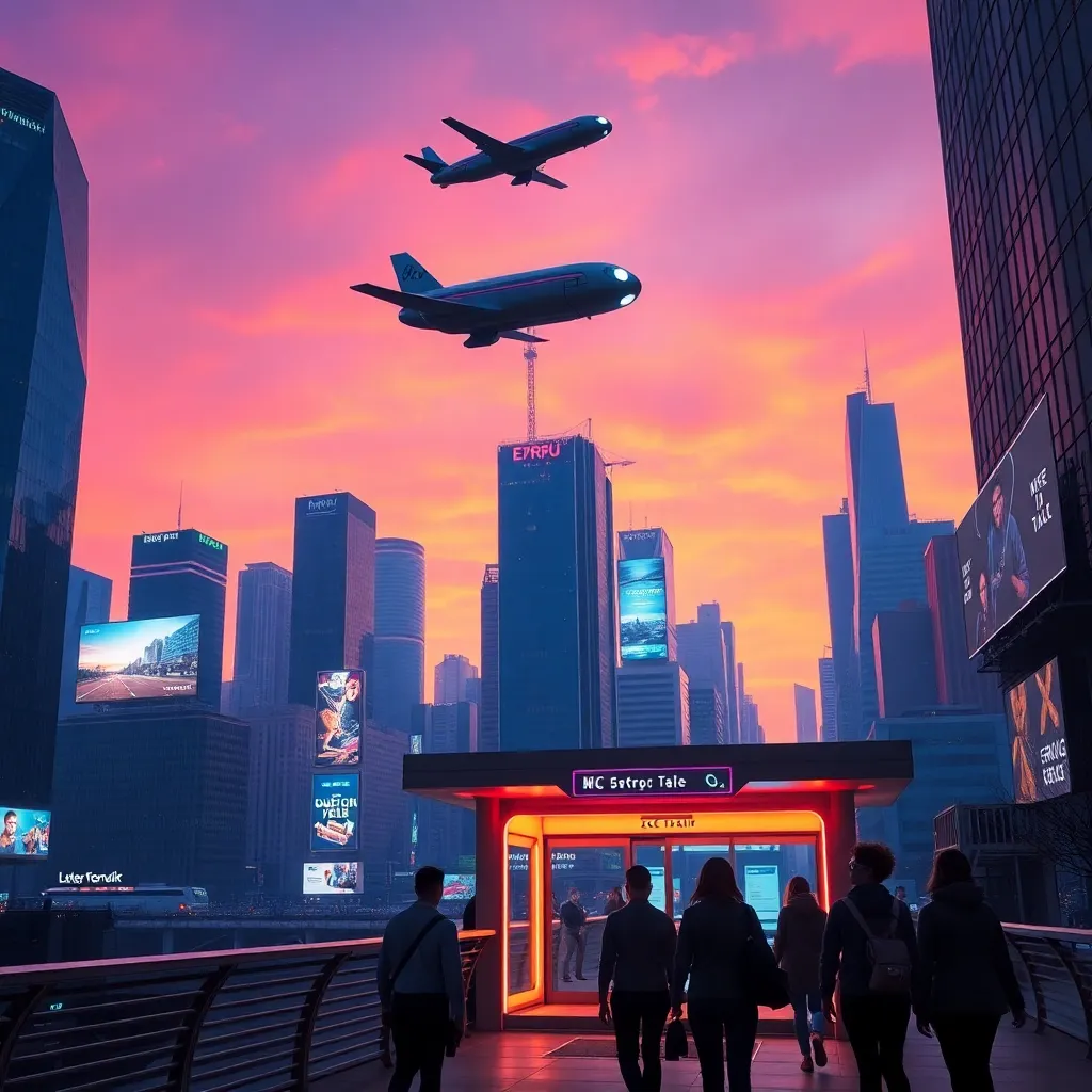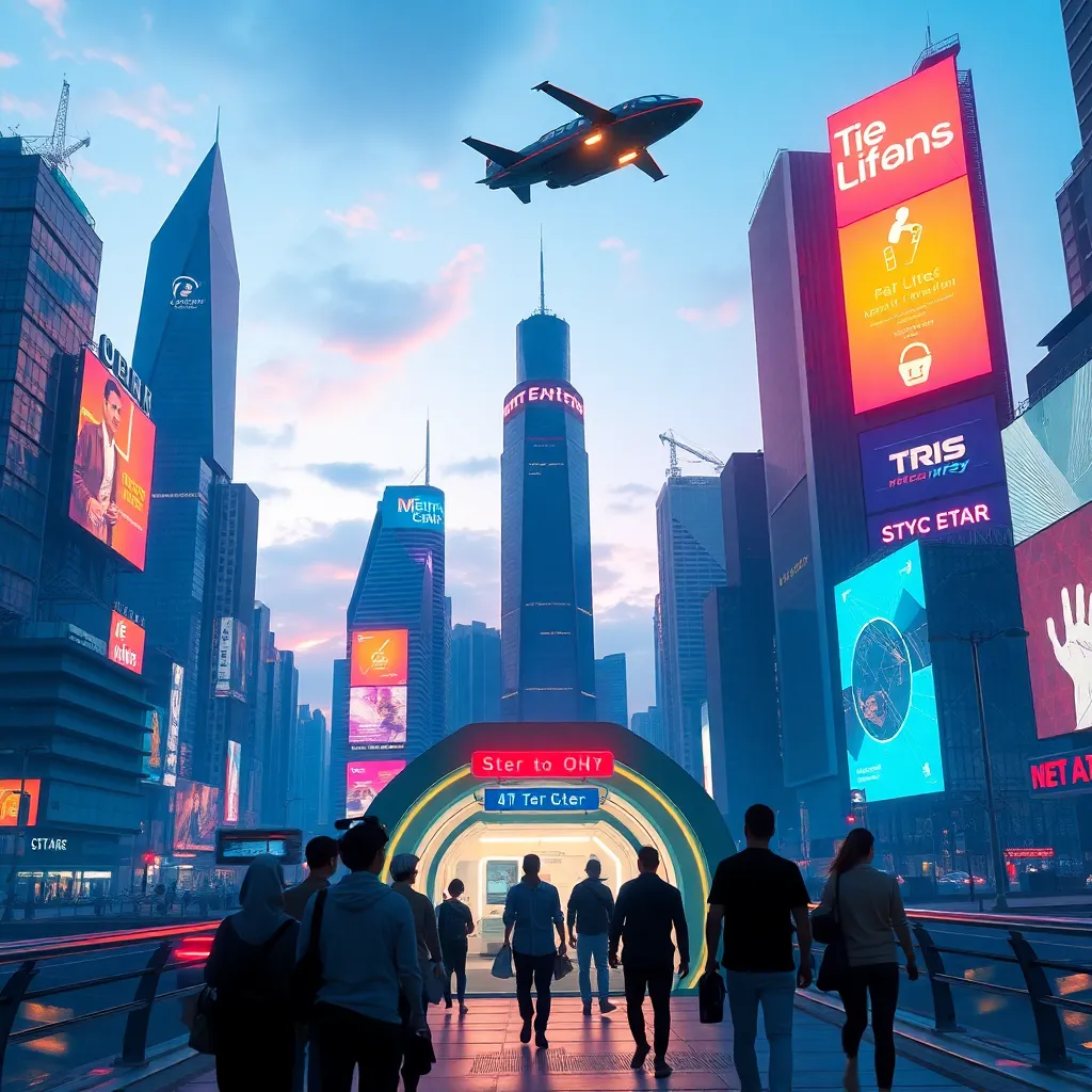 Create an image of a futuristic cityscape at dusk, with sleek skyscrapers and neon-lit billboards, a flying taxi hovering above, and a group of people in augmented reality glasses walking towards a glowing metro station. Incorporate vibrant colors and a sense of dynamism, blending tech and urban landscapes.