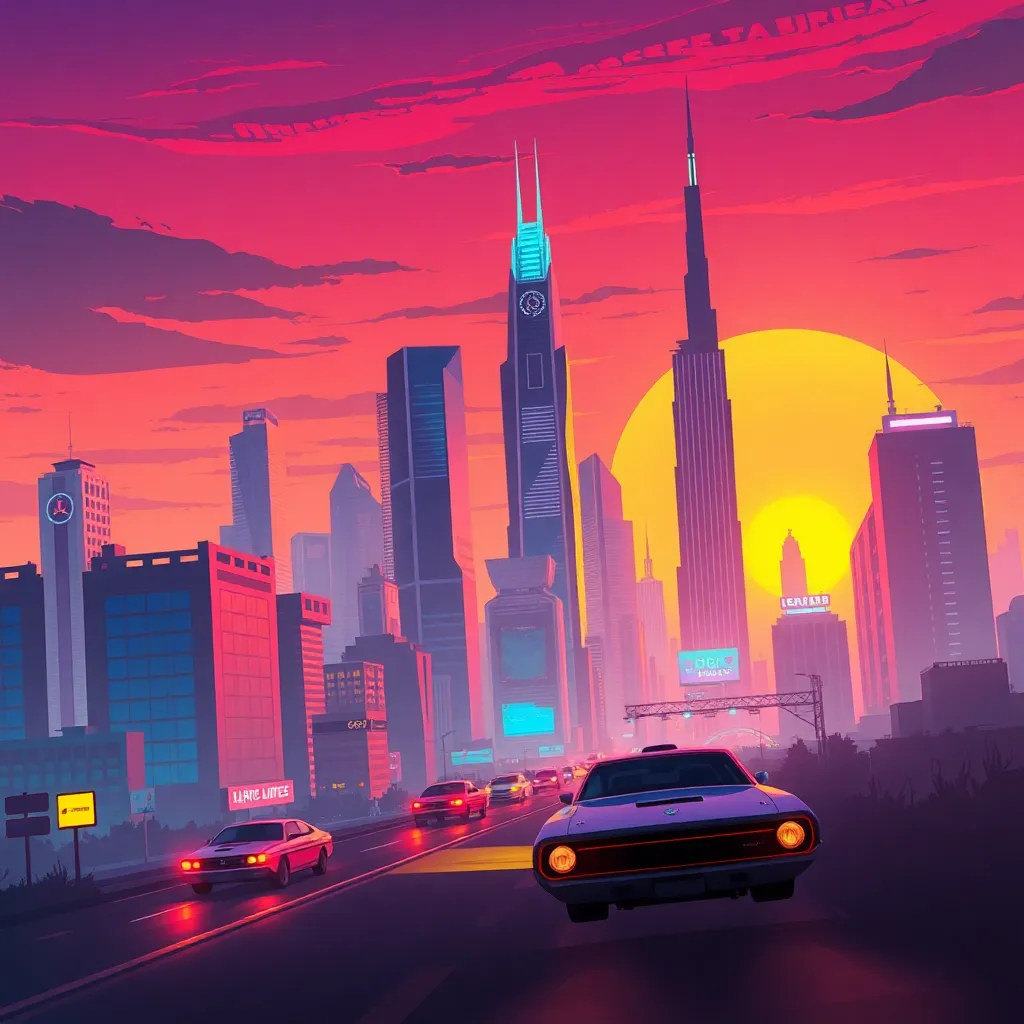Create an illustration of a futuristic cityscape at sunset, with sleek skyscrapers and flying cars zipping by. Incorporate vibrant colors and neon lights, with a subtle sense of nostalgia and a hint of sci-fi elements. The city should be bustling with activity, yet have a sense of serenity and calm.