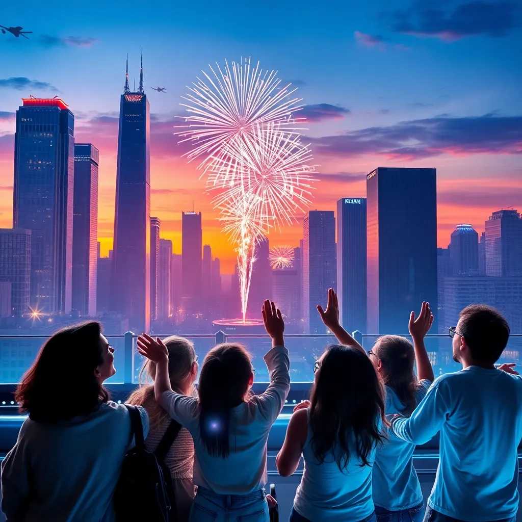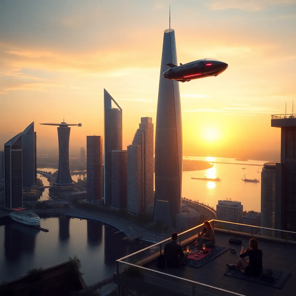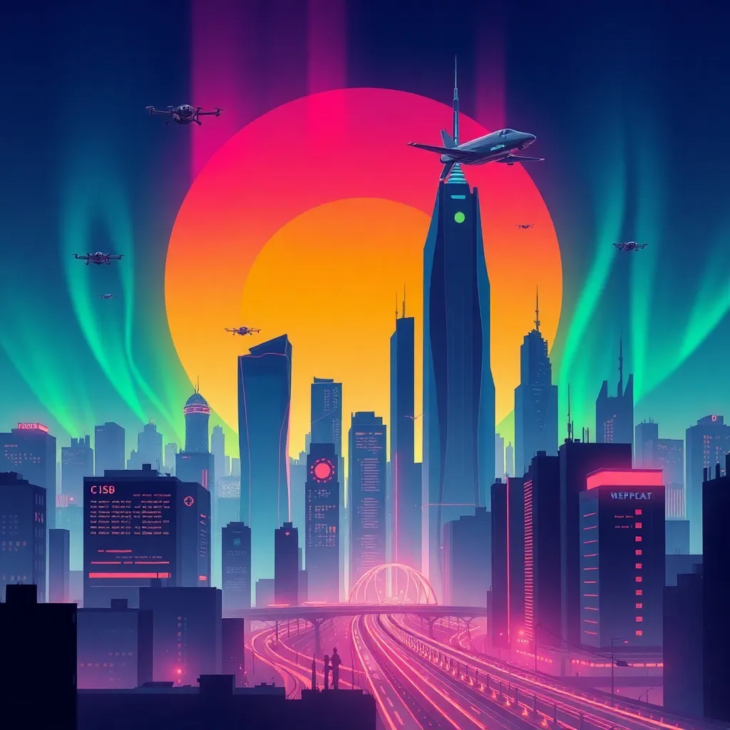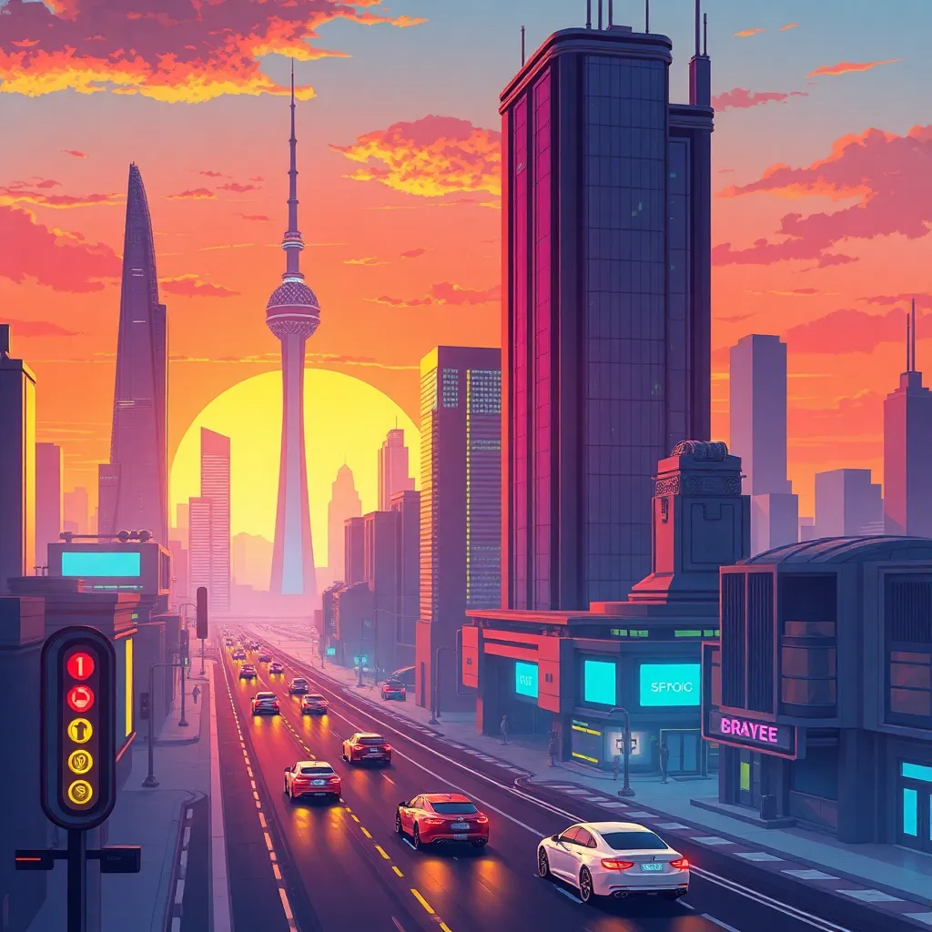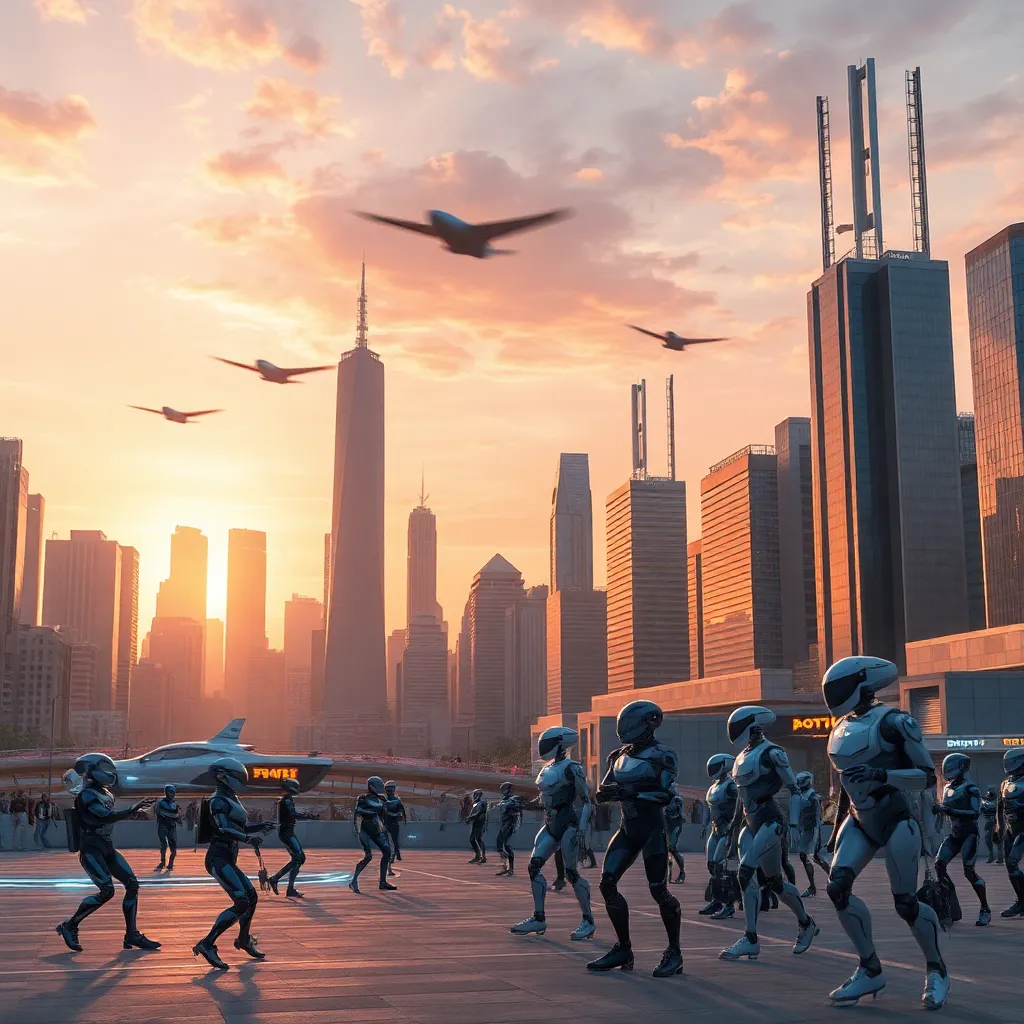 Imagine a futuristic cityscape at sunset, with sleek skyscrapers and flying cars zipping by. A group of robots, each with unique designs, are gathered at the city's central square, celebrating a technological breakthrough. The sky is painted with hues of orange, pink, and purple, and the atmosphere is electric with excitement.