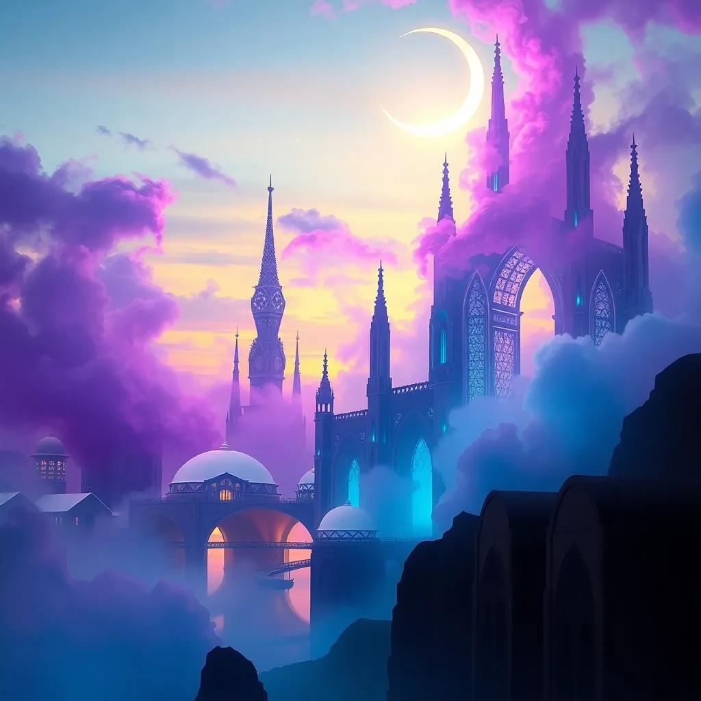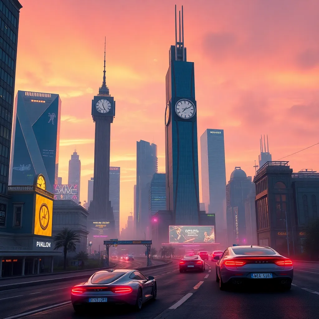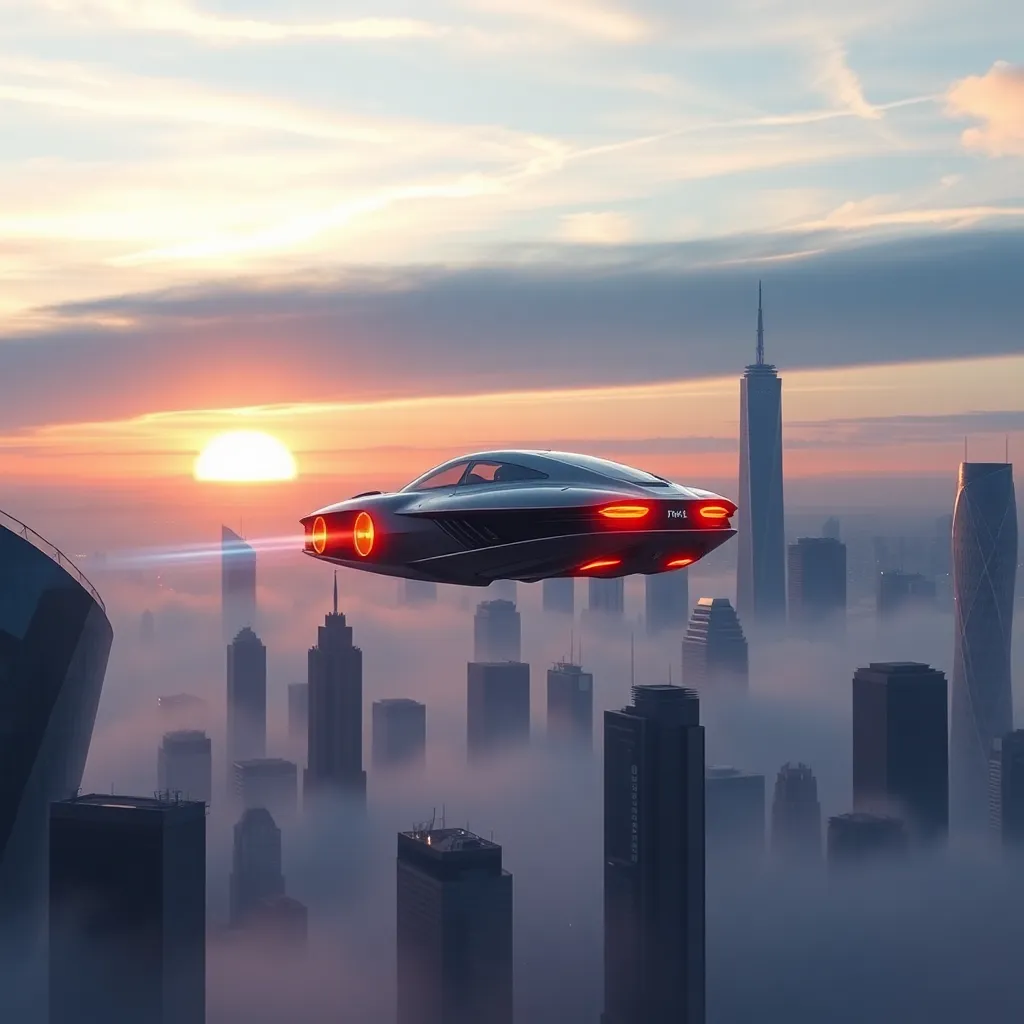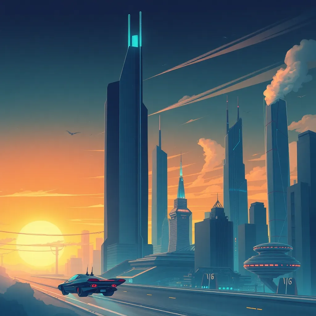 Create an illustration of a futuristic cityscape at sunset, with sleek skyscrapers, flying cars, and a vibrant atmosphere. Incorporate subtle neon lights, wispy clouds, and a hint of steam rising from the city's core. The scene should evoke a sense of innovation, progress, and limitless possibility.