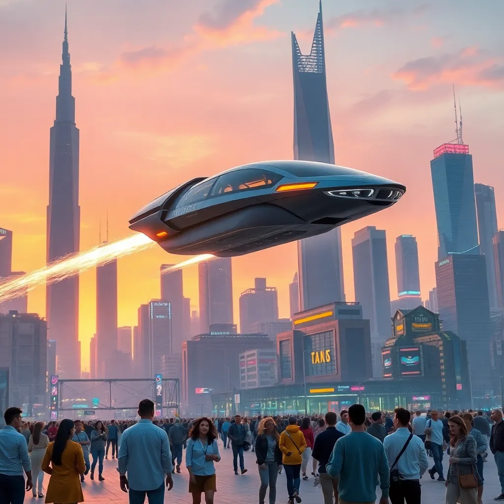 Create a futuristic cityscape at sunset, with towering skyscrapers and neon-lit streets. Incorporate a sleek, high-tech vehicle hovering above the ground, emitting a trail of sparks. Include a diverse group of people from different cultures and professions, all gathered at a central square, enjoying the vibrant atmosphere.