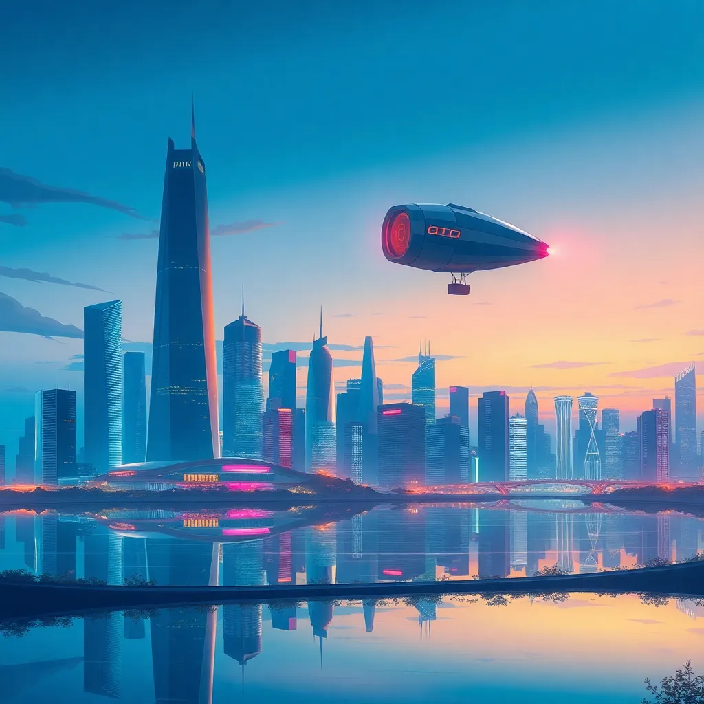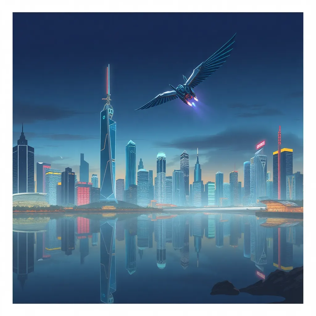 Create an imaginative illustration of a futuristic cityscape at dusk, with sleek skyscrapers and neon lights reflecting off the calm waters of a nearby lake. Incorporate a majestic winged vehicle soaring above the city, with a subtle glow emanating from its wings. Style should be a blend of sci-fi and fantasy.