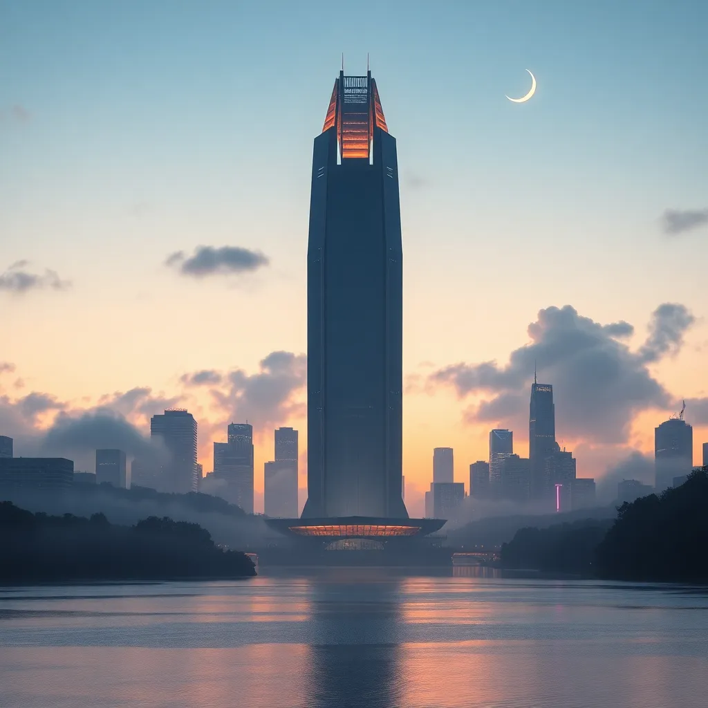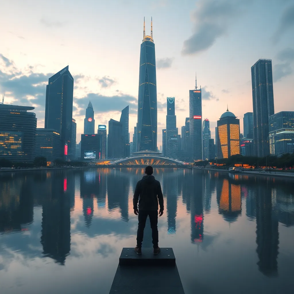 Imagine a futuristic cityscape at dusk, with sleek skyscrapers and neon lights reflected in the calm waters of a nearby lake. A lone figure stands at the edge, gazing out at the breathtaking view. The city is bustling with activity, yet the atmosphere is peaceful and serene. Generate an image that captures this moment.
