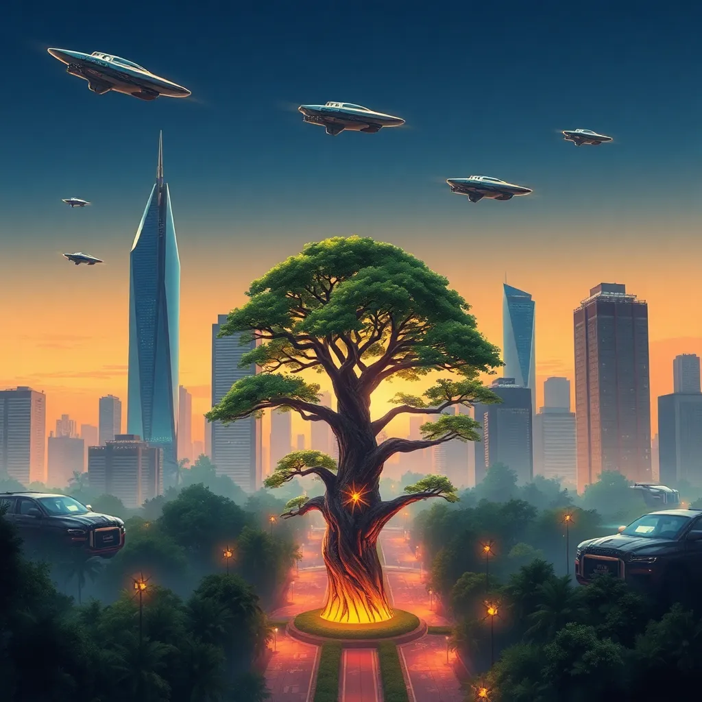 Create an illustration of a futuristic cityscape at sunset, with sleek skyscrapers and flying cars hovering above. Incorporate a majestic, glowing tree in the center, surrounded by lush greenery and vibrant streetlights. Use warm, golden hues to capture the serene atmosphere of this futuristic urban oasis.