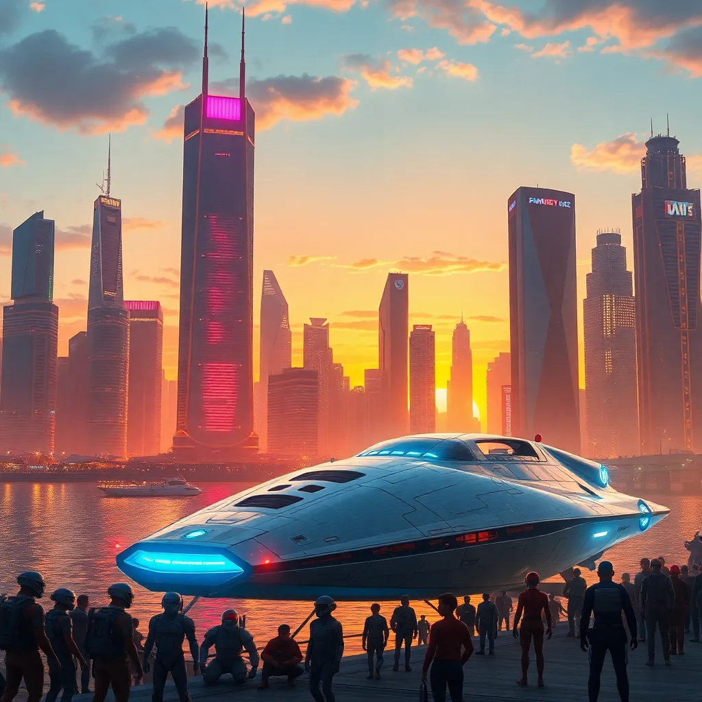 Imagine a futuristic cityscape at sunset, with sleek skyscrapers and neon lights reflecting off the water. In the foreground, a majestic spaceship with a glowing blue hull is docked, surrounded by curious robots and humans in futuristic attire. The atmosphere is vibrant and electric, with a sense of excitement and discovery.