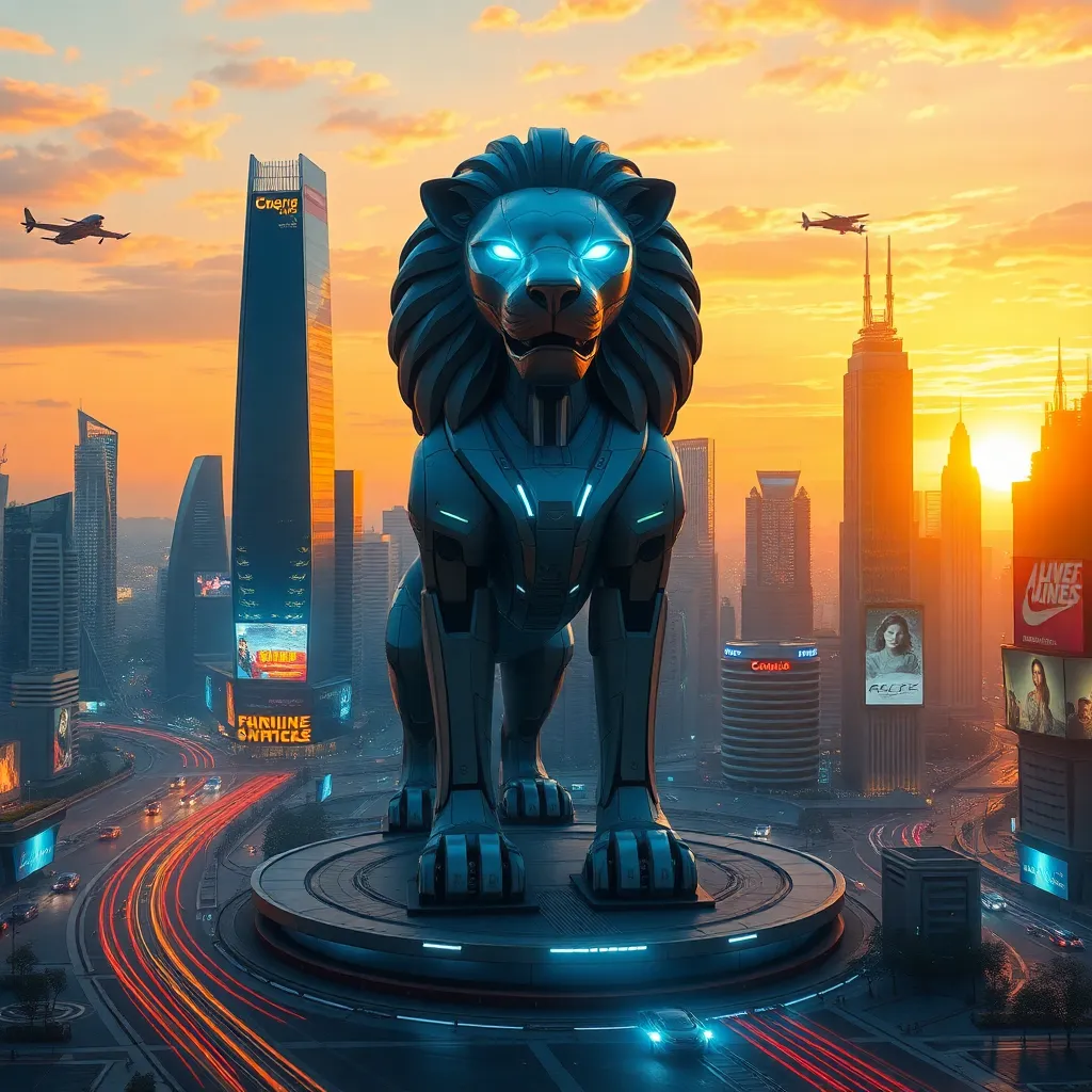 Imagine a futuristic cityscape at sunset, with sleek skyscrapers and flying cars zipping by. In the center, a giant robotic lion statue stands tall, its eyes glowing bright blue. The surrounding city is filled with neon lights and holographic advertisements. Generate an image that captures the vibrant, high-tech atmosphere.