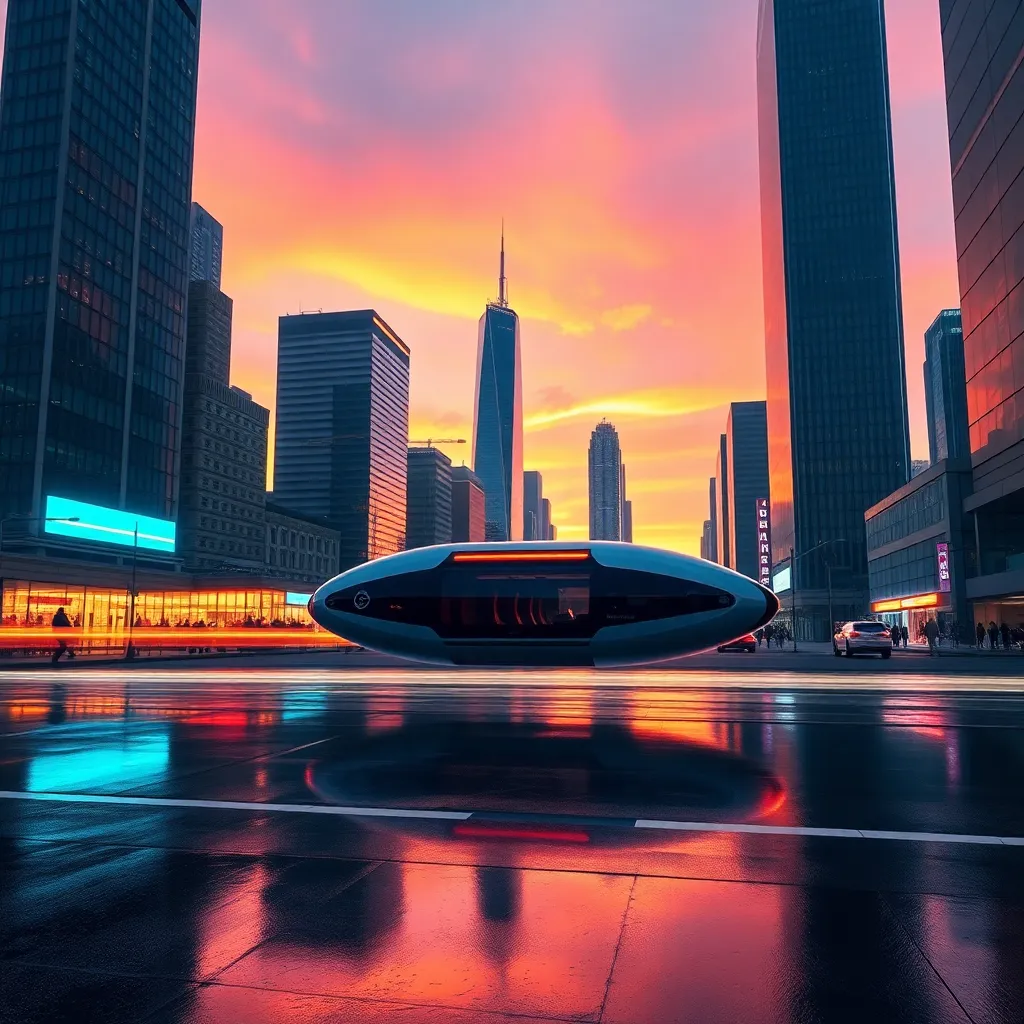 Imagine a futuristic cityscape at dusk, with sleek skyscrapers and neon lights reflecting off the wet pavement. In the center, a levitating hyperloop pod zooms by, leaving a trail of glowing particles. The sky is painted with hues of orange, pink, and purple. Generate an image that captures this scene.