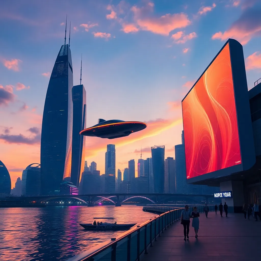 Create an futuristic cityscape at sunset, with sleek skyscrapers and neon lights reflecting off the water. Incorporate a hovercar flying overhead, a group of people walking along the waterfront promenade, and a giant digital billboard displaying a futuristic advertisement. Use vibrant colors and a sense of movement to capture the energy of the city.