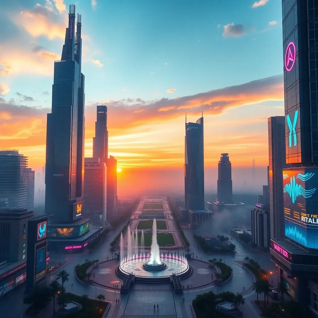 Create a futuristic cityscape at sunset with towering skyscrapers, sleek architecture, and a vibrant atmosphere. Incorporate neon lights, holographic advertisements, and a sense of dynamic energy. Include a prominent central plaza with a grand fountain and a sprawling park in the distance, with a hint of fog and mist.