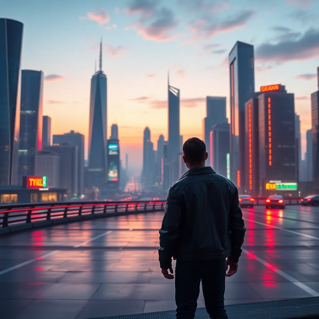Imagine a futuristic cityscape at dusk, with sleek skyscrapers and neon lights reflecting off the wet pavement. A lone figure in a black leather jacket stands at the edge of the city, looking out at the distant horizon with a sense of longing and adventure. Generate an image that captures this scene.