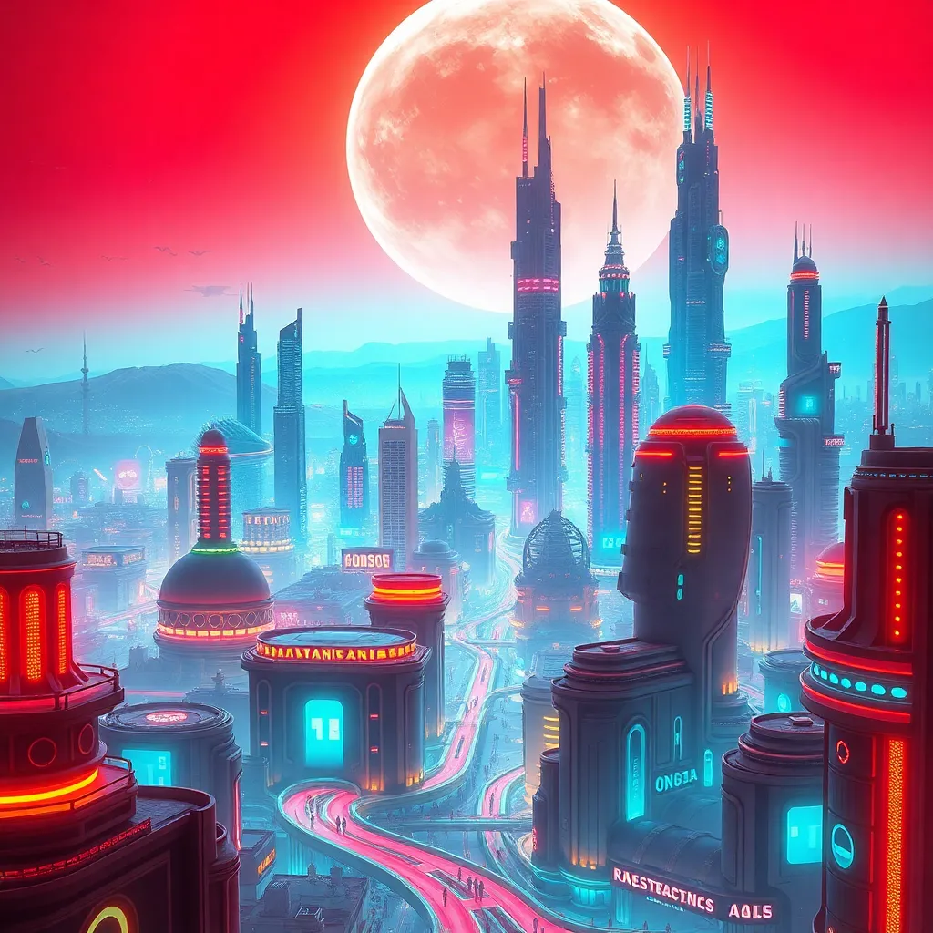 Create a futuristic cityscape with towering skyscrapers and neon lights. The city is set on a distant planet with a crimson sky. Incorporate a sprawling metropolis with curved architecture, glowing streets, and hovering transportation. The atmosphere should be vibrant and futuristic, with a sense of otherworldly exploration.