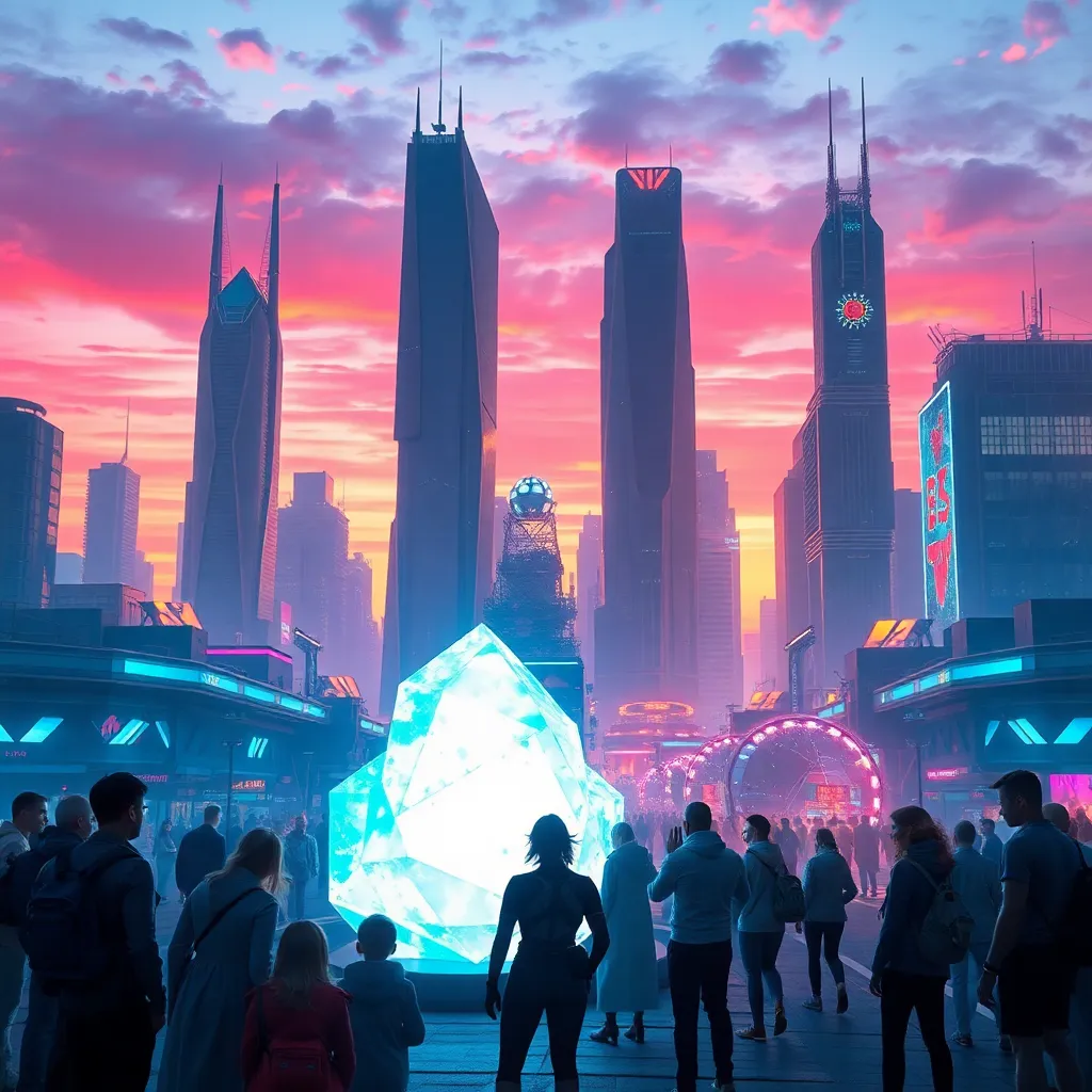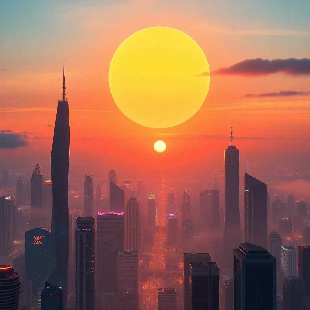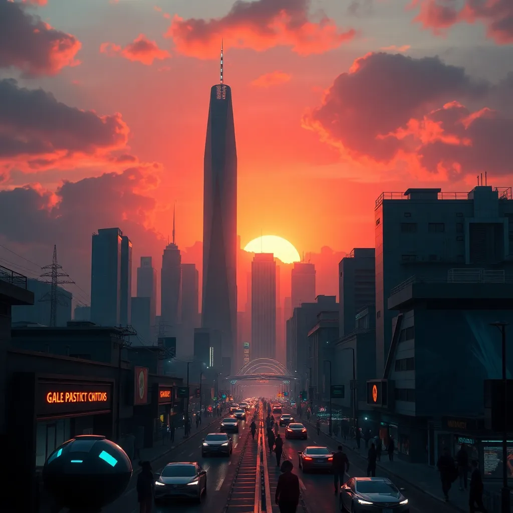 Imagine a city of the future where towering skyscrapers made of gleaming metals and glass pierce the sky. The streets are filled with sleek, hover cars and pedestrians wearing augmented reality contact lenses. In the distance, a massive, glowing orb rises above the city, casting a warm, ethereal light.