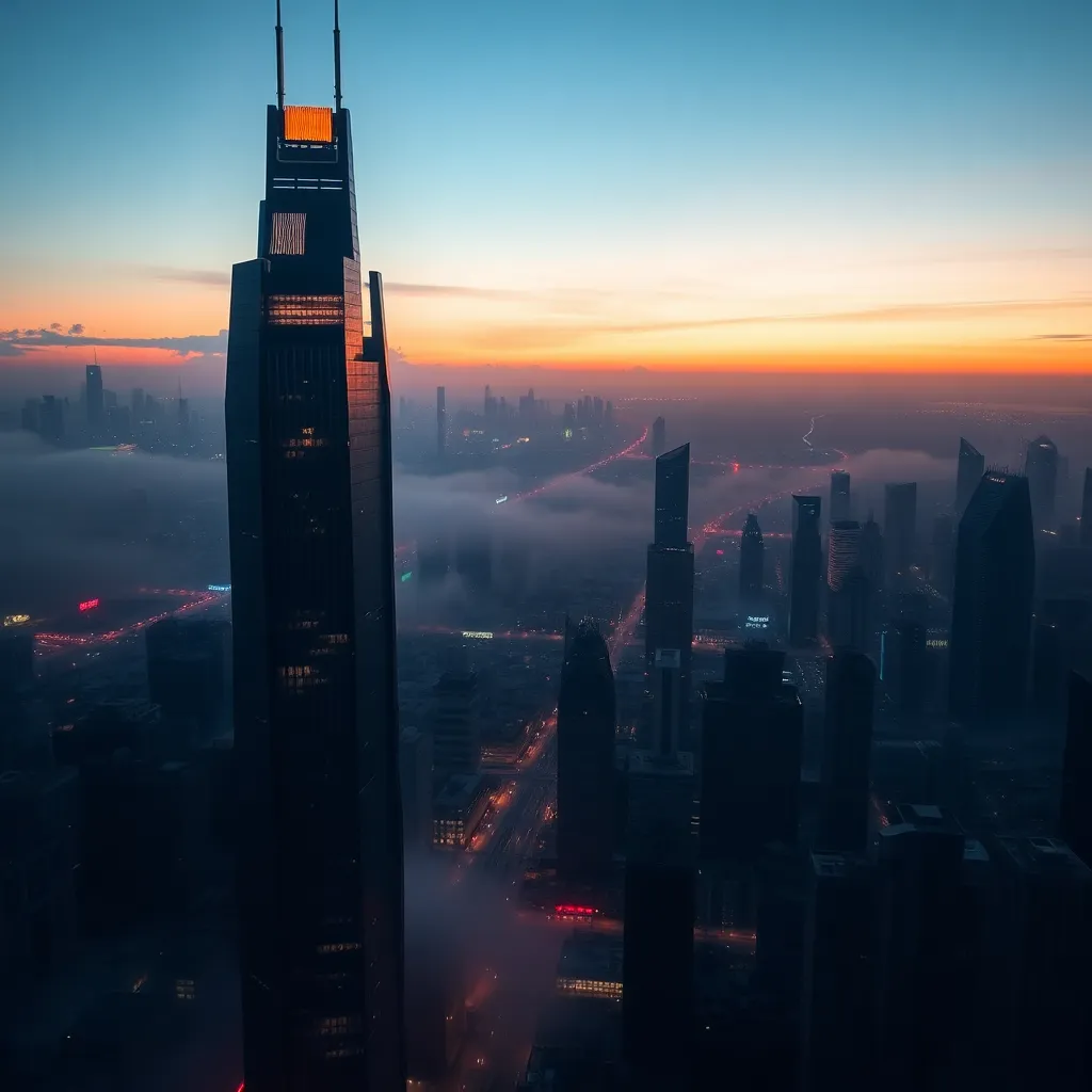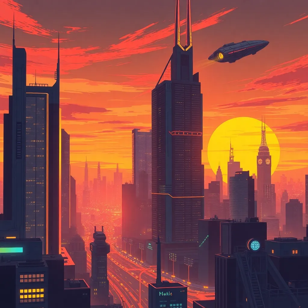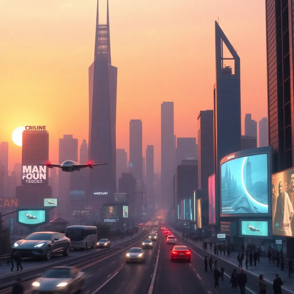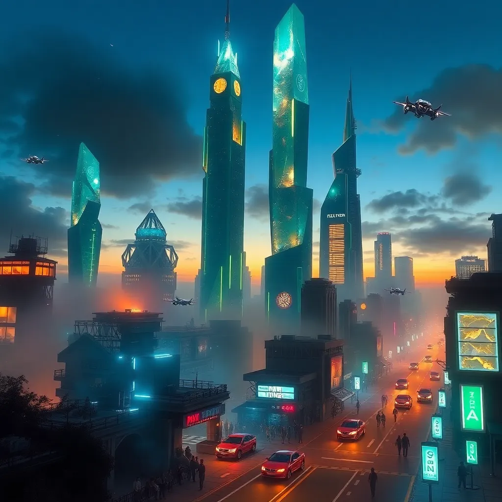 Imagine a city of the future where towering skyscrapers made of gleaming metals and glass pierce the sky. The streets are filled with sleek, hover cars and pedestrians wearing augmented reality contact lenses. In the distance, a massive, glowing orb rises above the city, casting a warm, ethereal light.